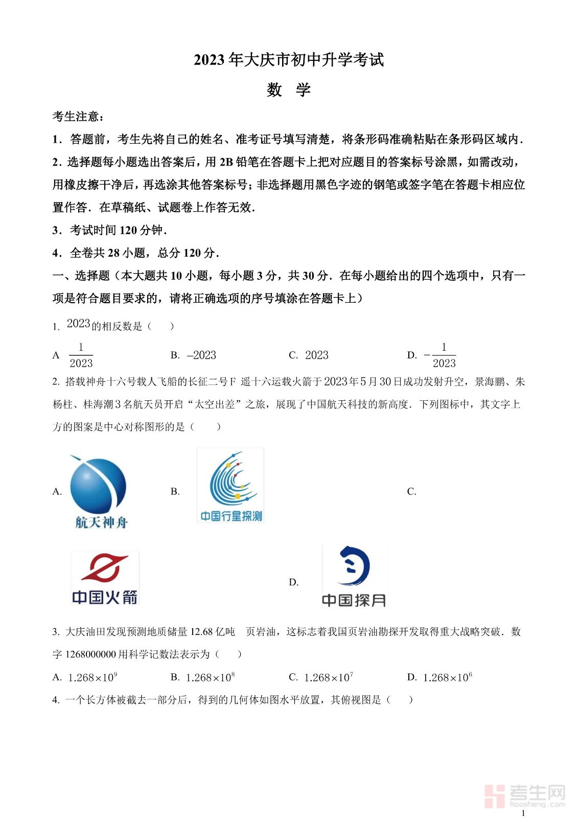 2023年黑龙江省大庆市中考数学真题 (原卷版)