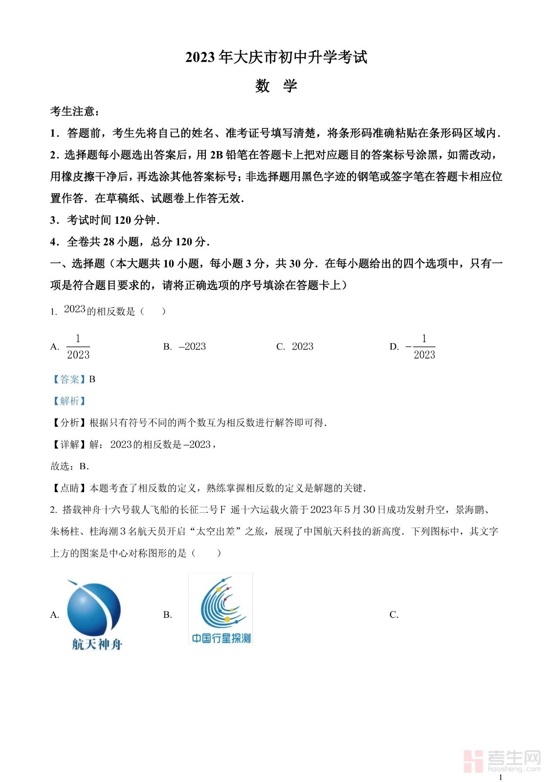 2023年黑龙江省大庆市中考数学真题 (解析版)