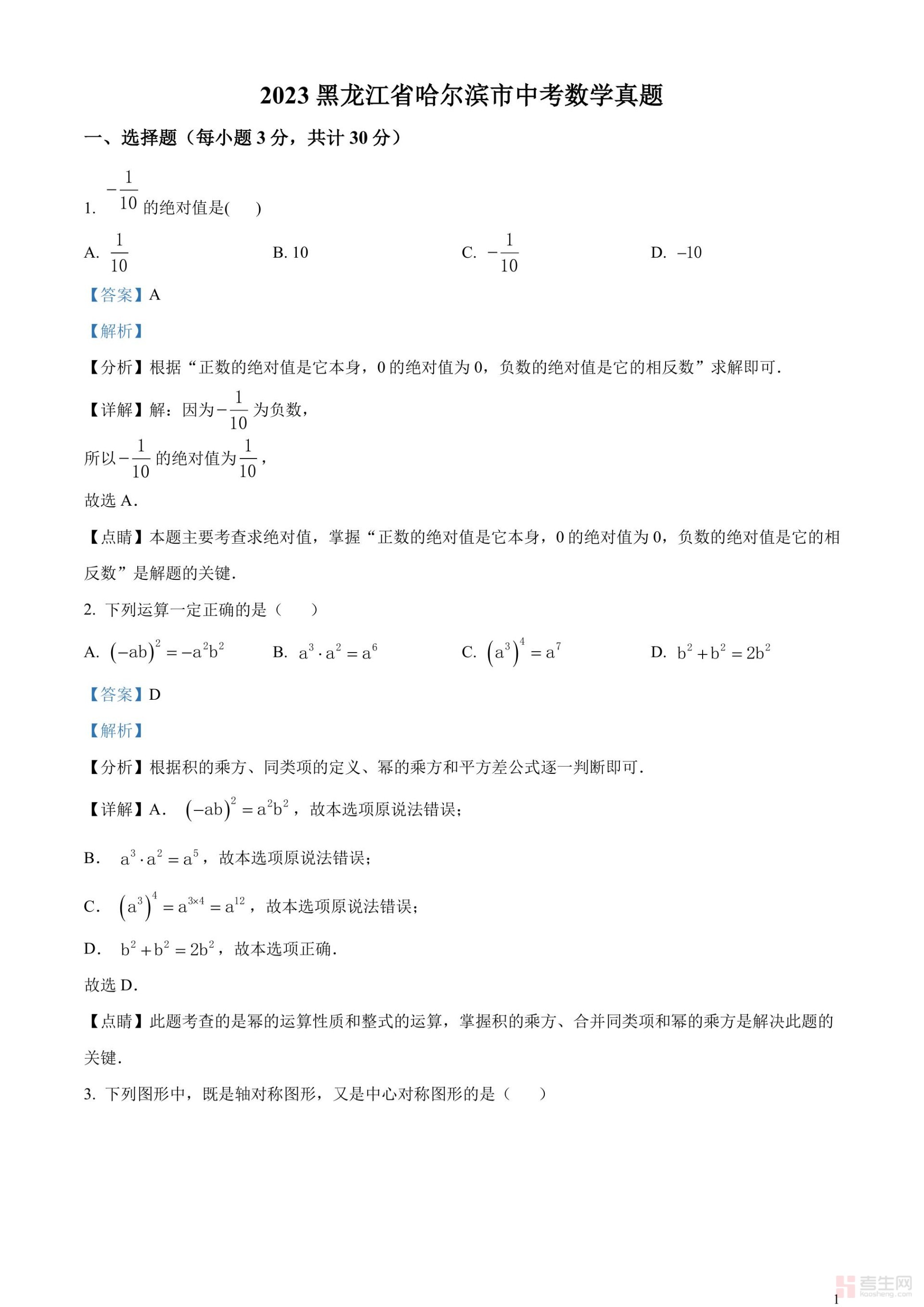 2023年黑龙江省哈尔滨市中考数学真题(解析版)