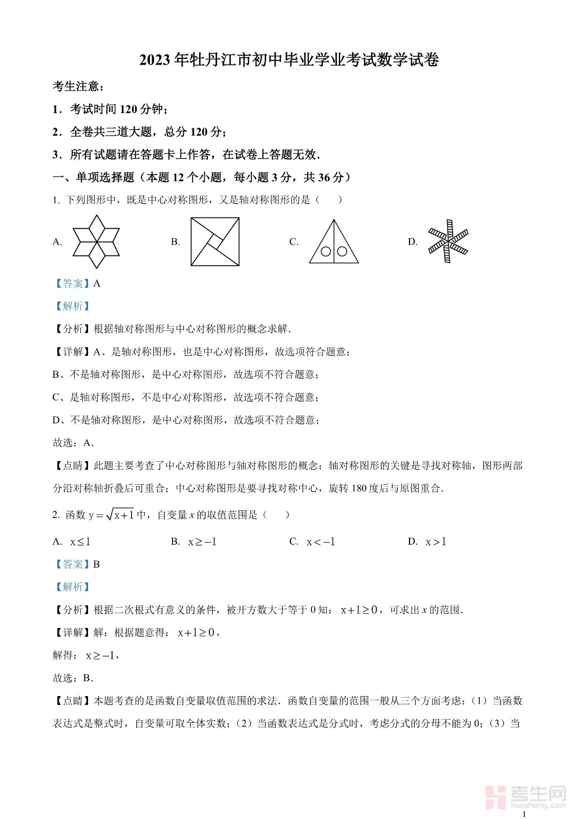 2023年黑龙江省牡丹江市中考数学真题(解析版)