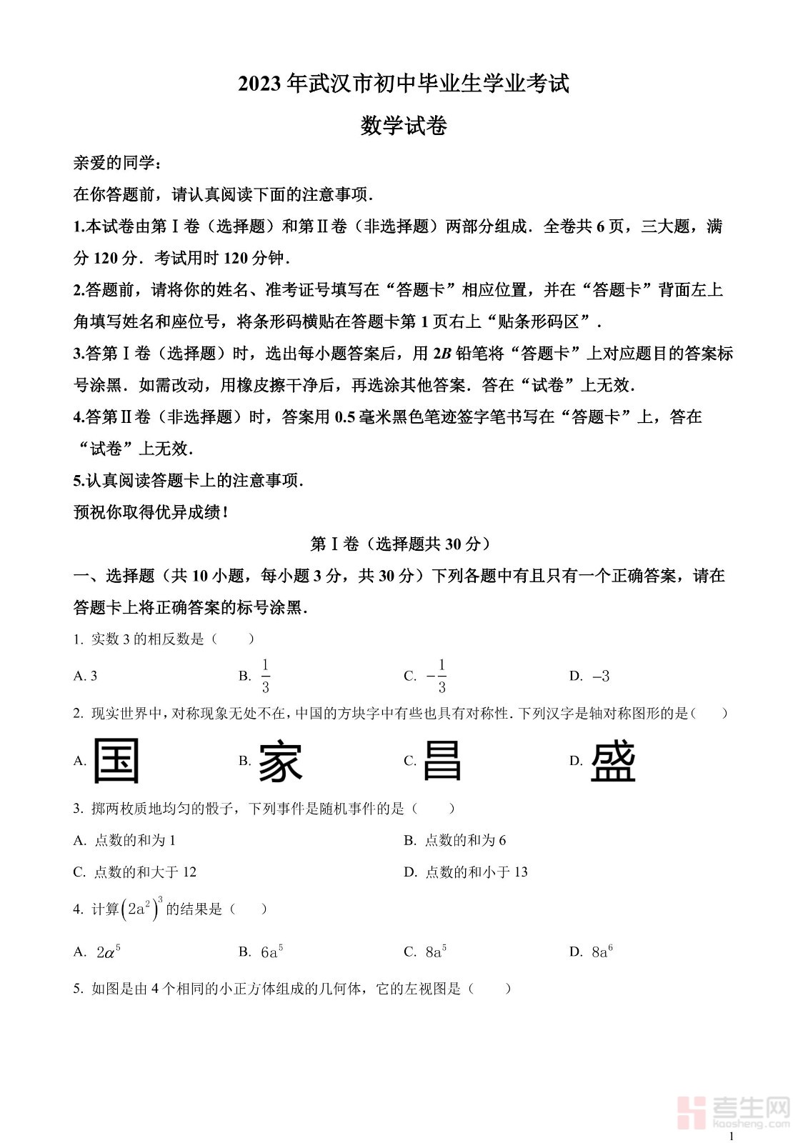 2023年湖北省武汉市数学真题(原卷版)