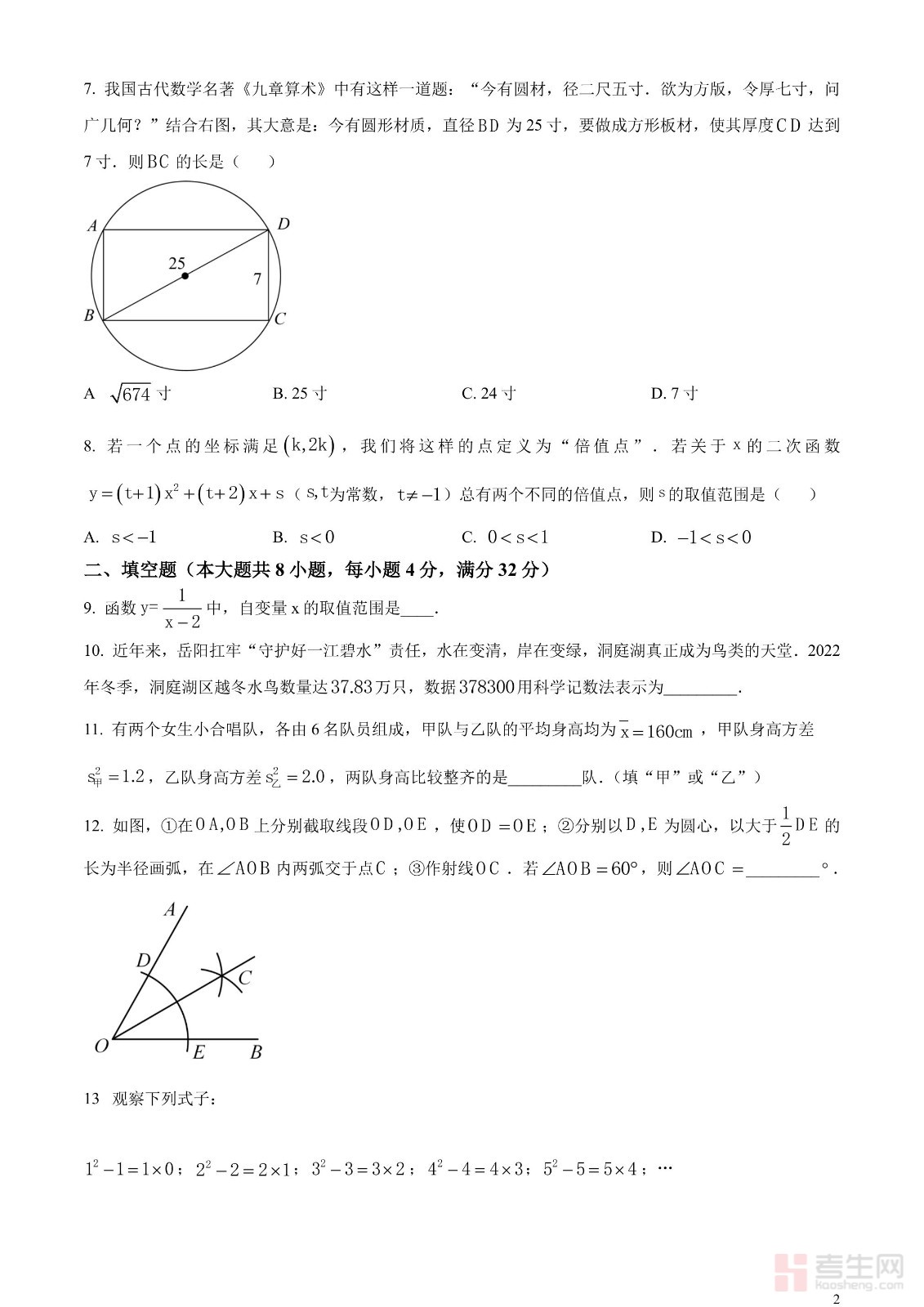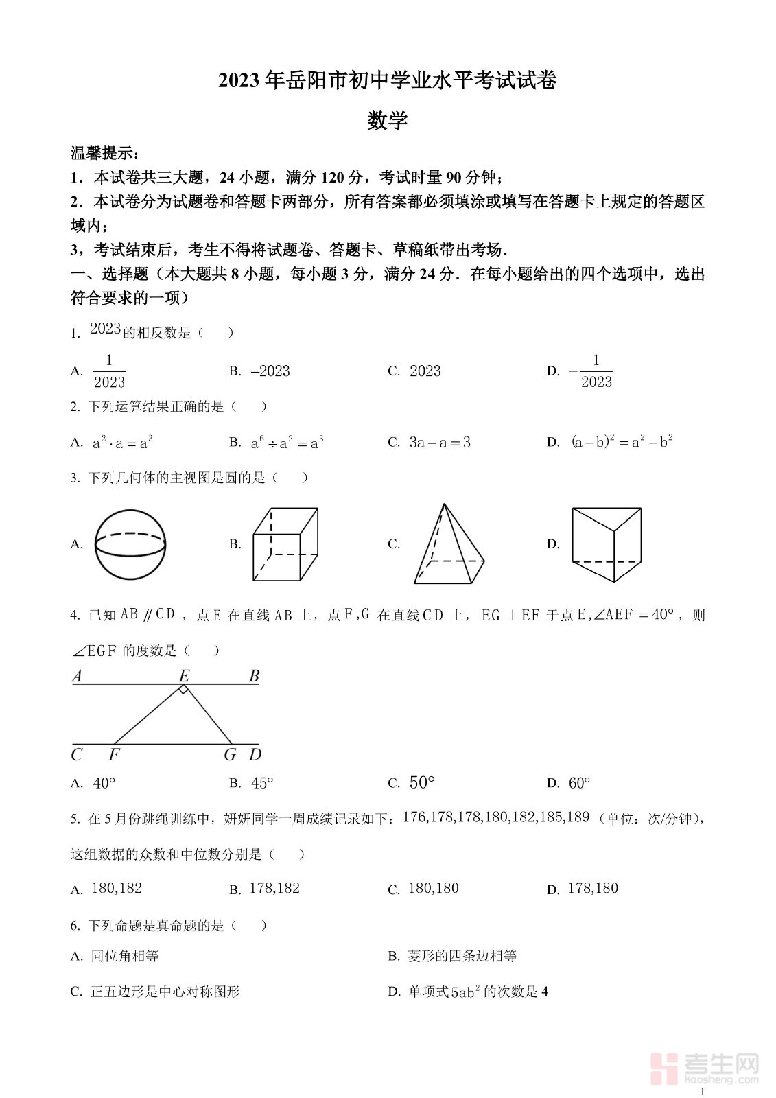 2023年湖南省岳阳市中考数学真题(原卷版)