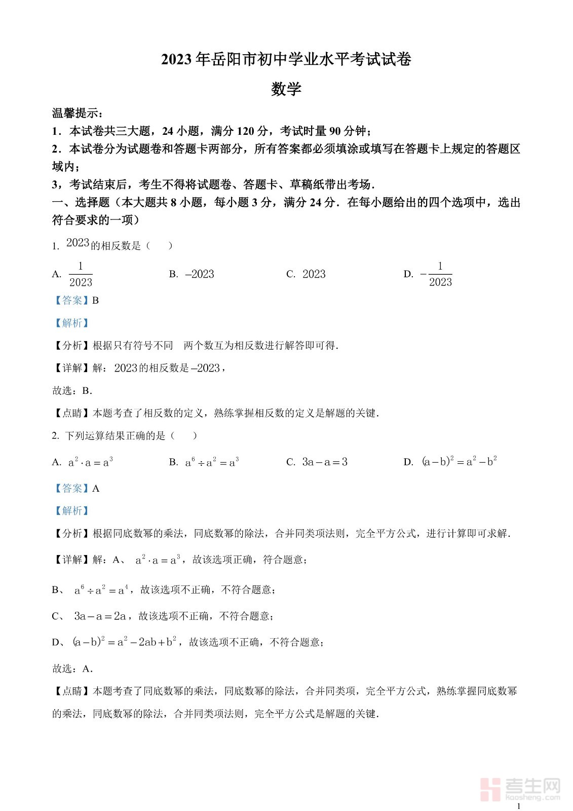 2023年辽宁省沈阳市中考数学真题(解析版)