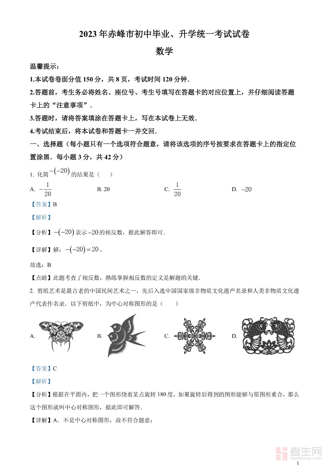 2023年内蒙古赤峰市中考数学真题(解析版)