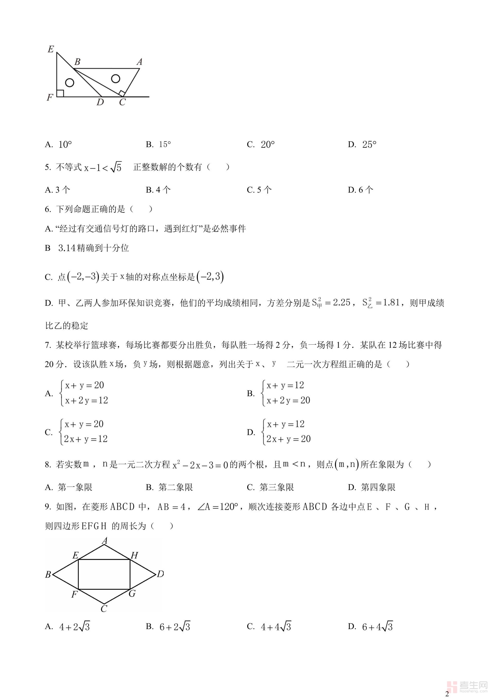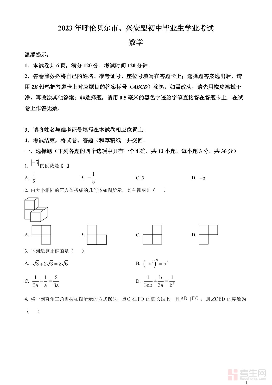 2023年内蒙古自治区呼伦贝尔市、兴安盟中考数学真题 (原卷版)