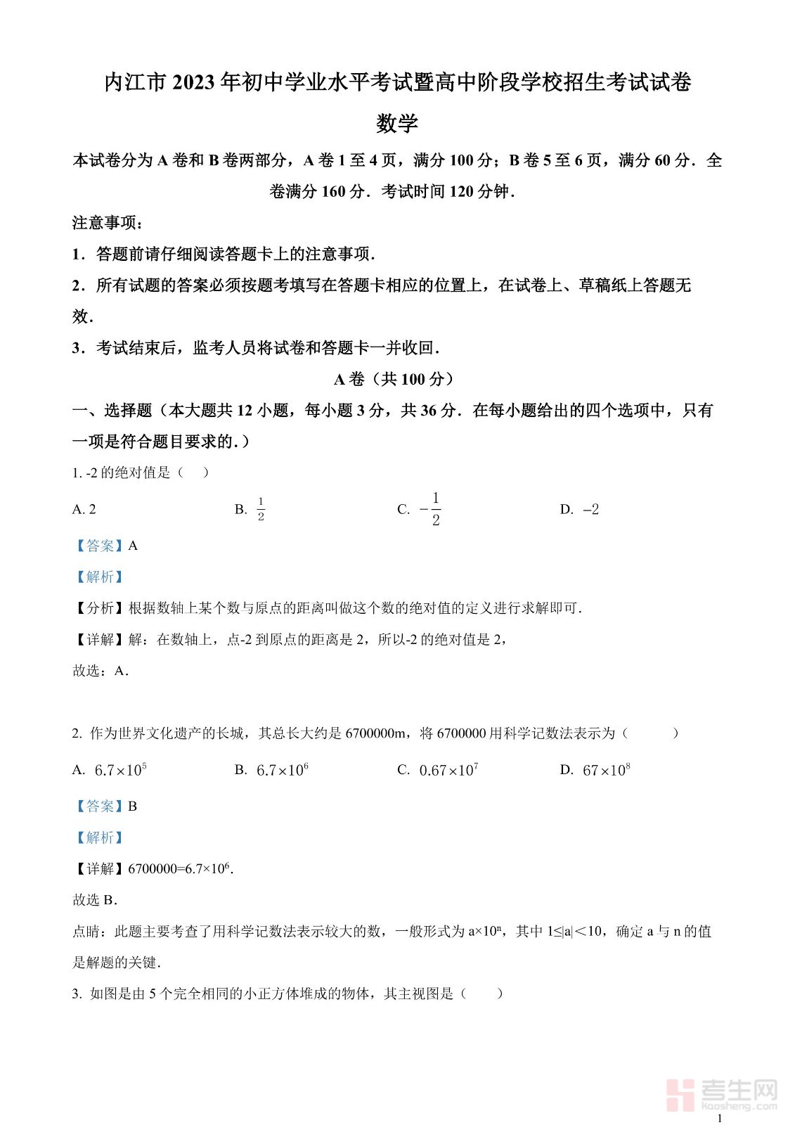 2023年四川省内江市中考数学真题(解析版)