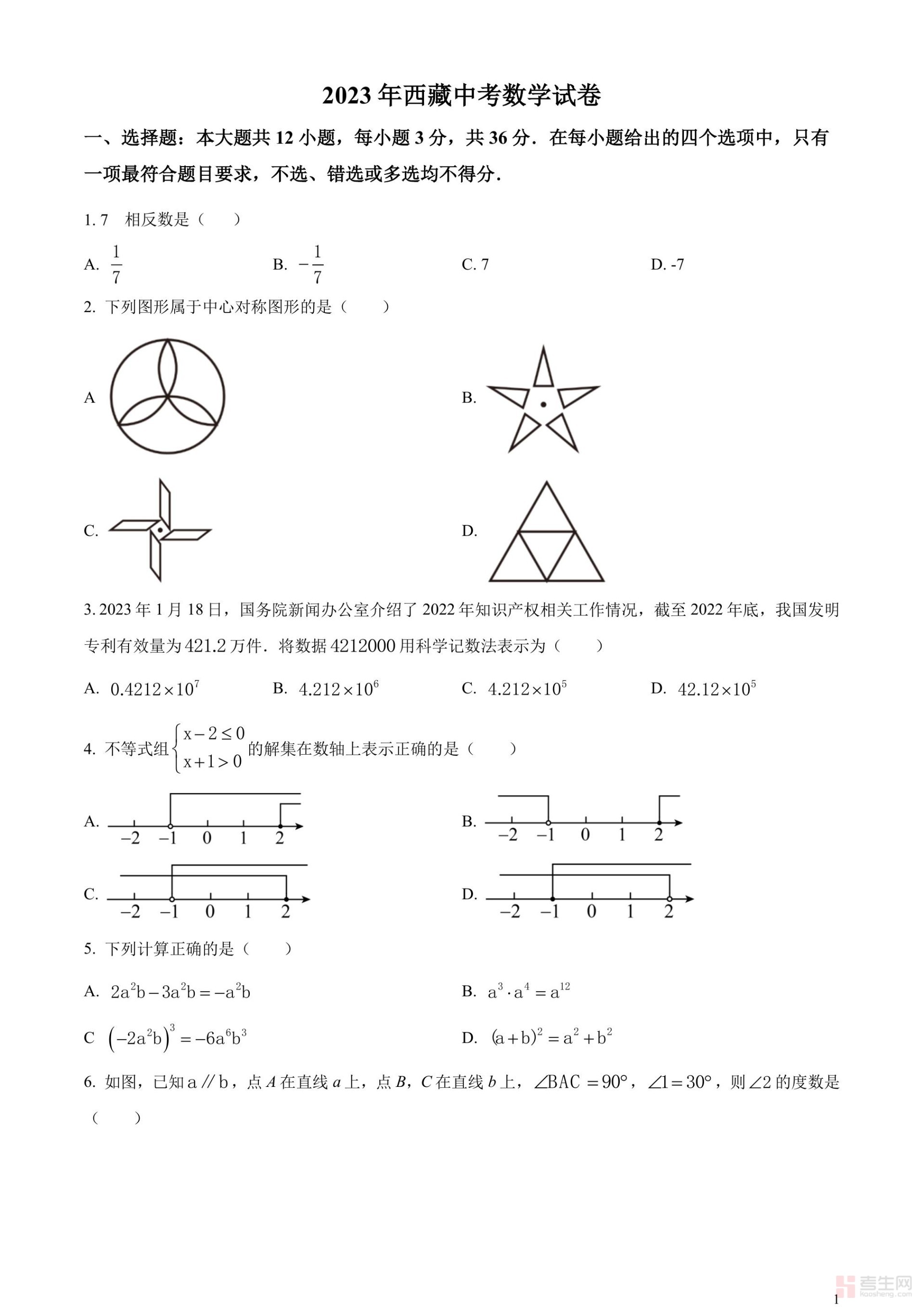 2023年西藏自治区中考数学真题(原卷版)