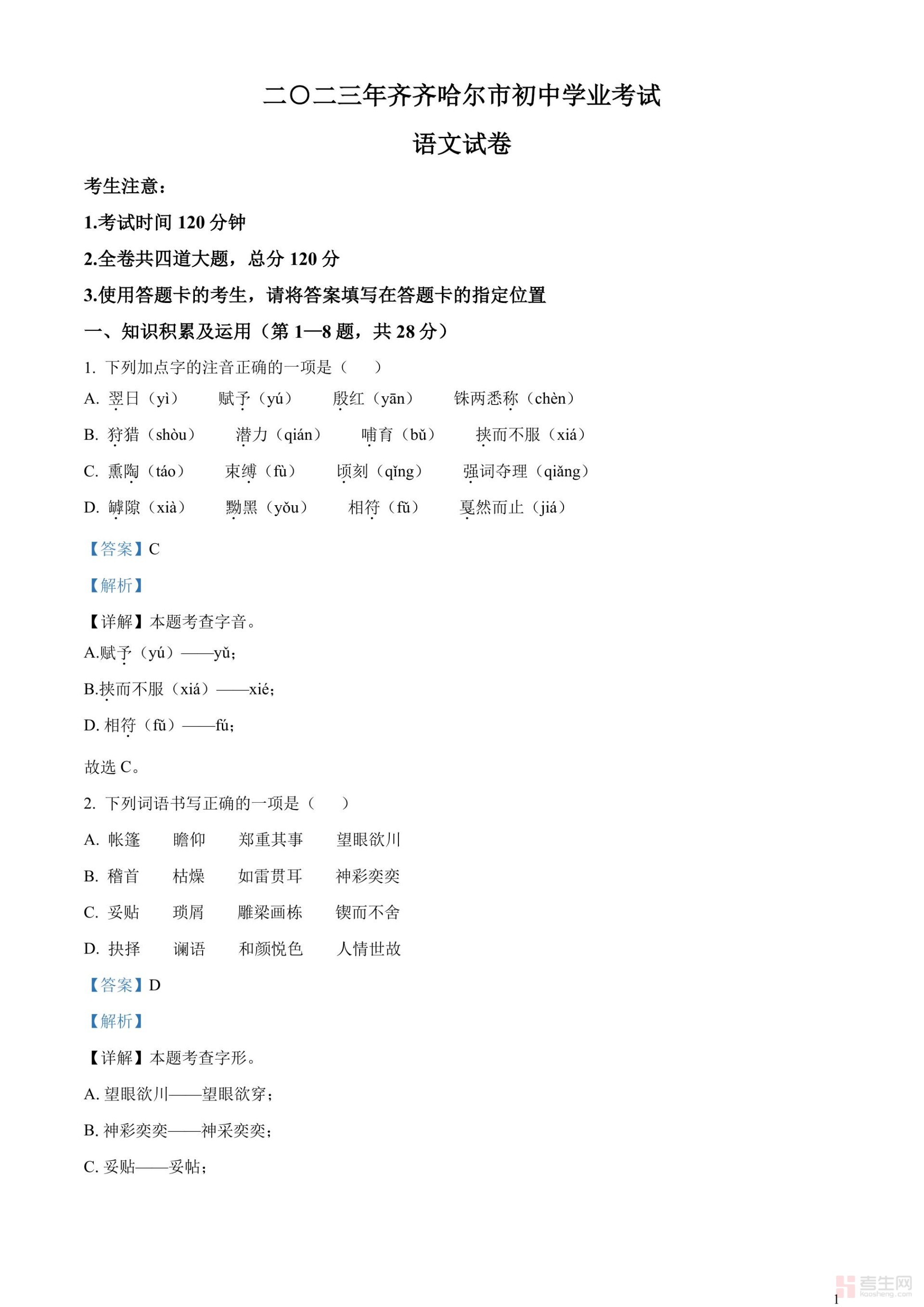 2023年黑龙江省齐齐哈尔市中考语文真题(解析版)