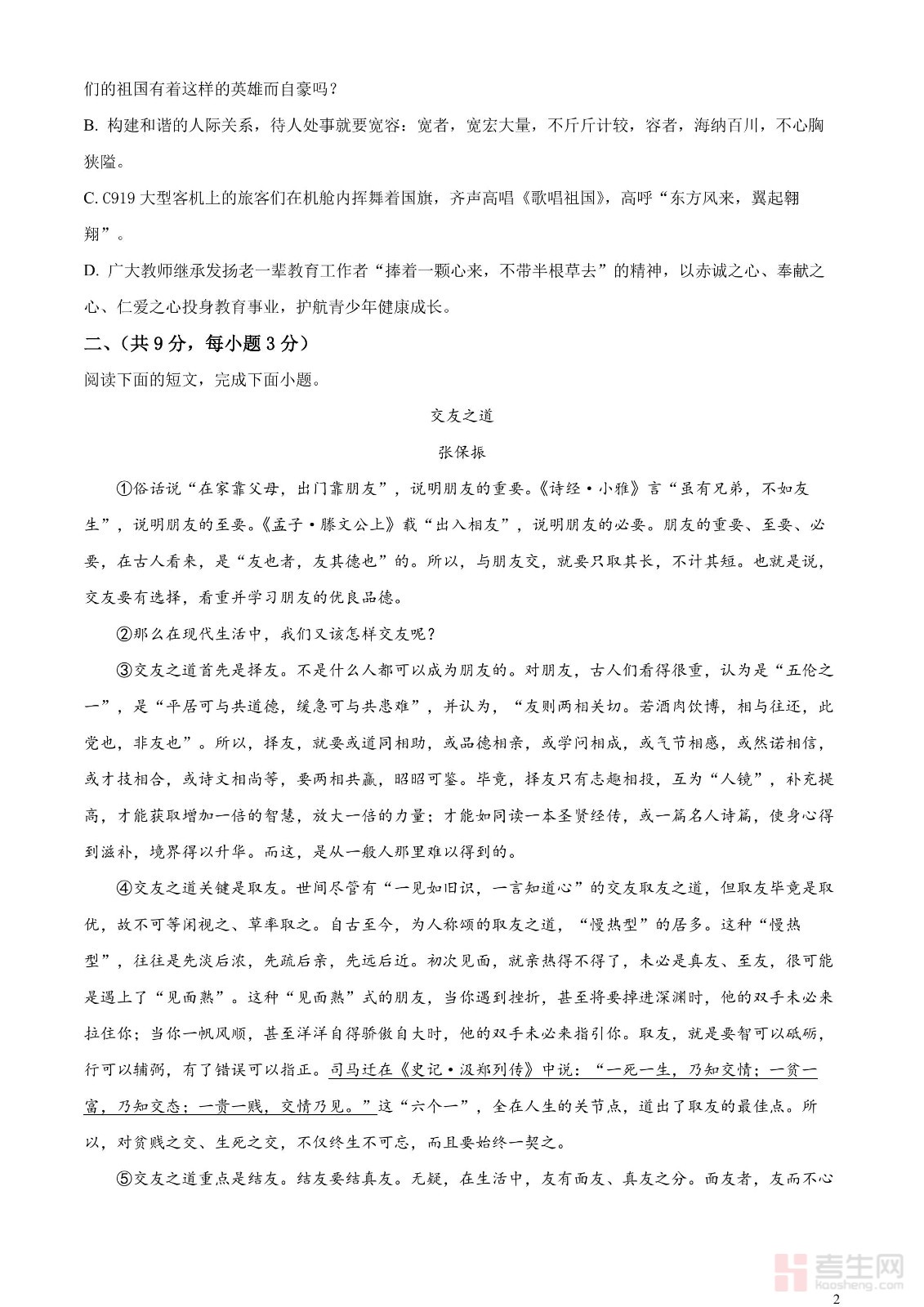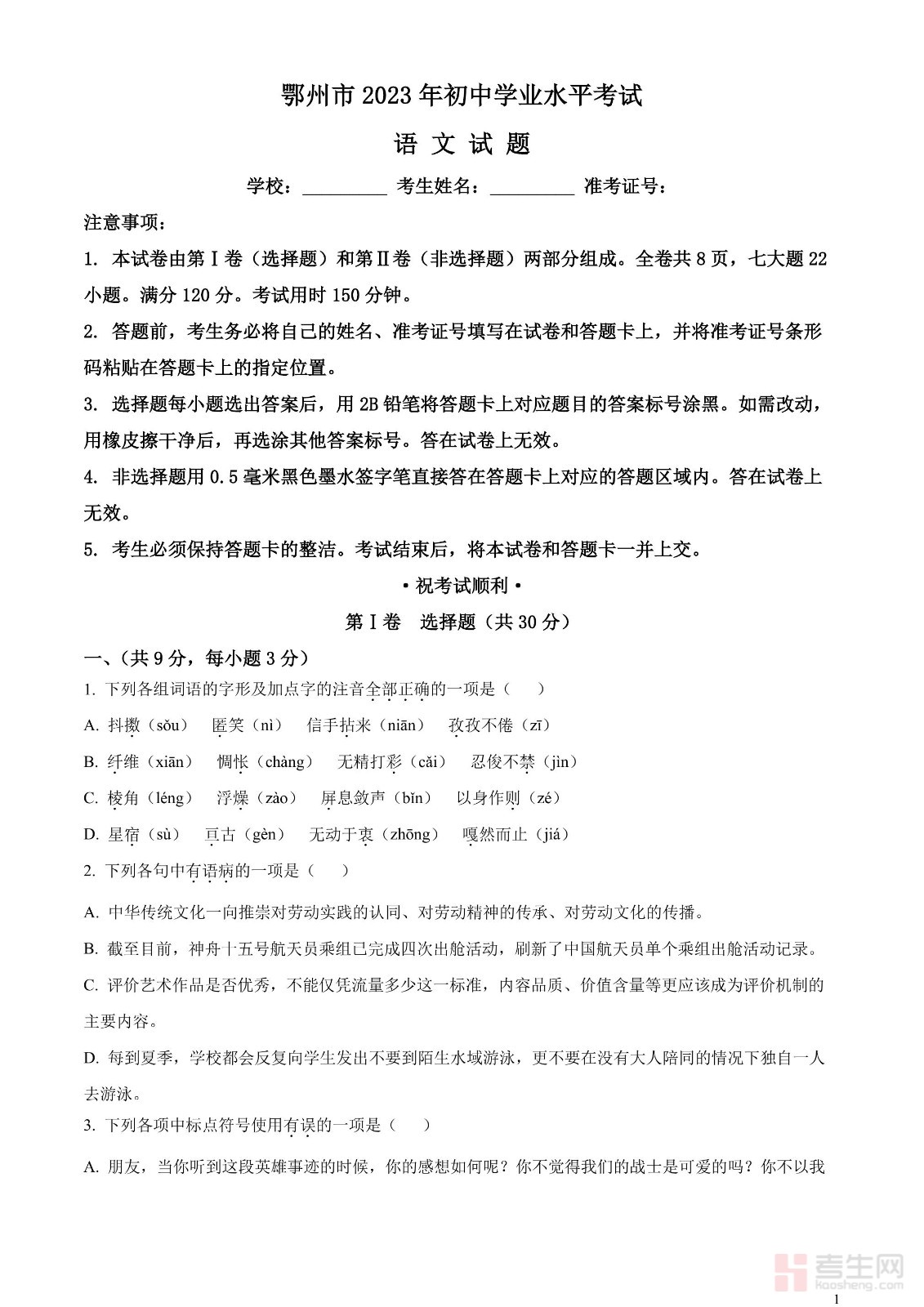 2023年湖北省鄂州市中考语文试题(原卷版)