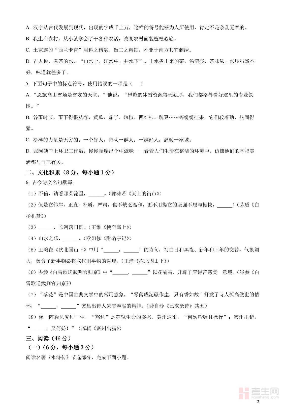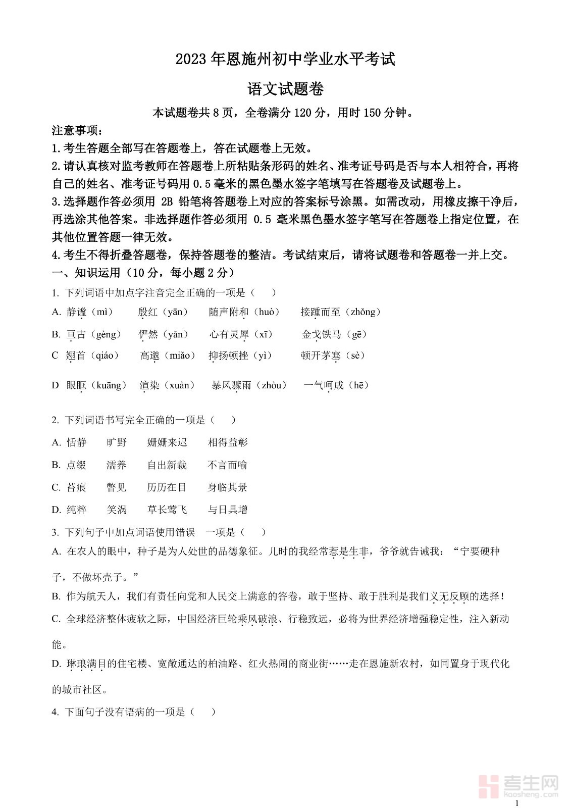 2023年湖北省恩施州市中考语文真题(原卷版)