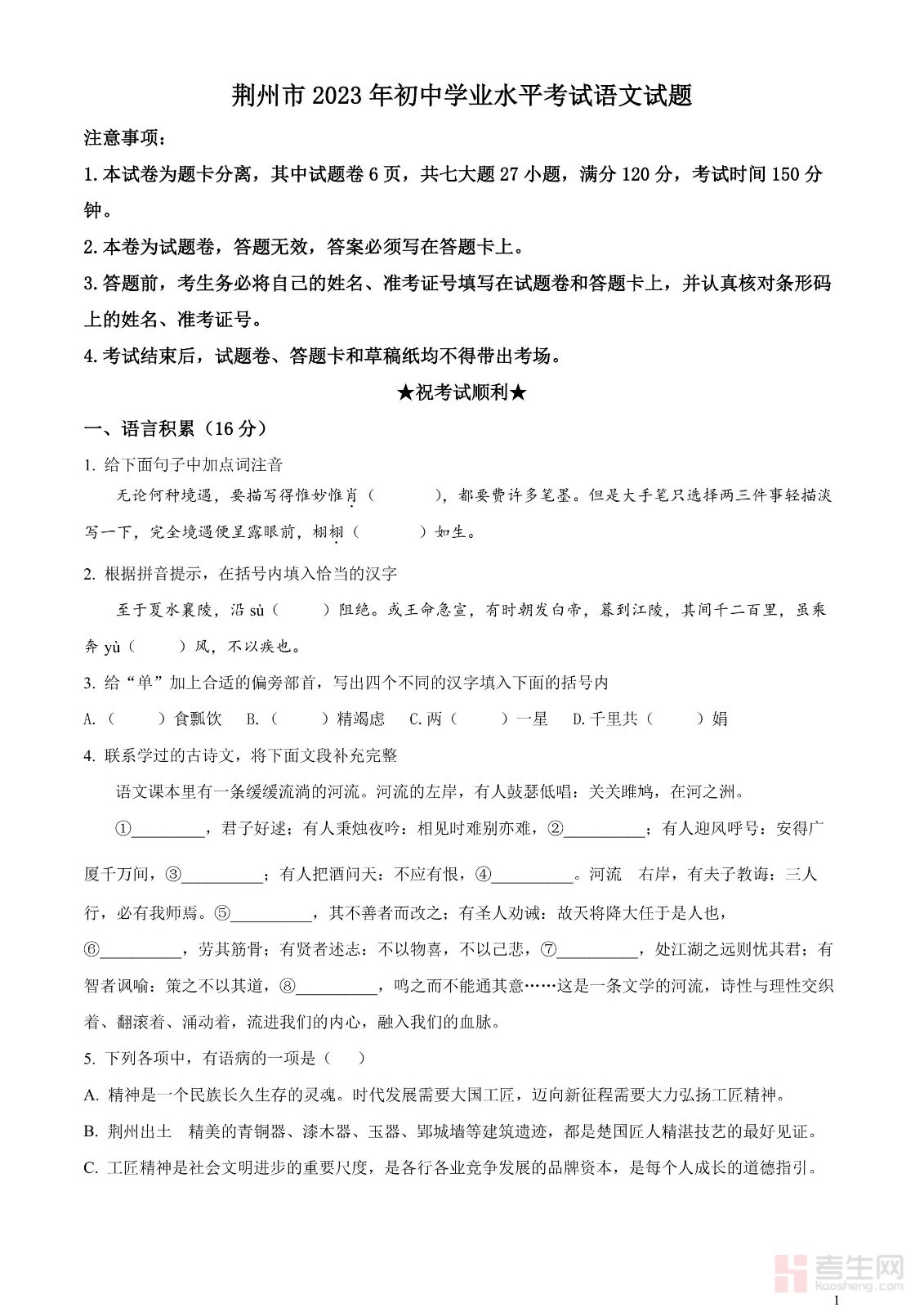 2023年湖北省荆州市中考语文真题(原卷版)