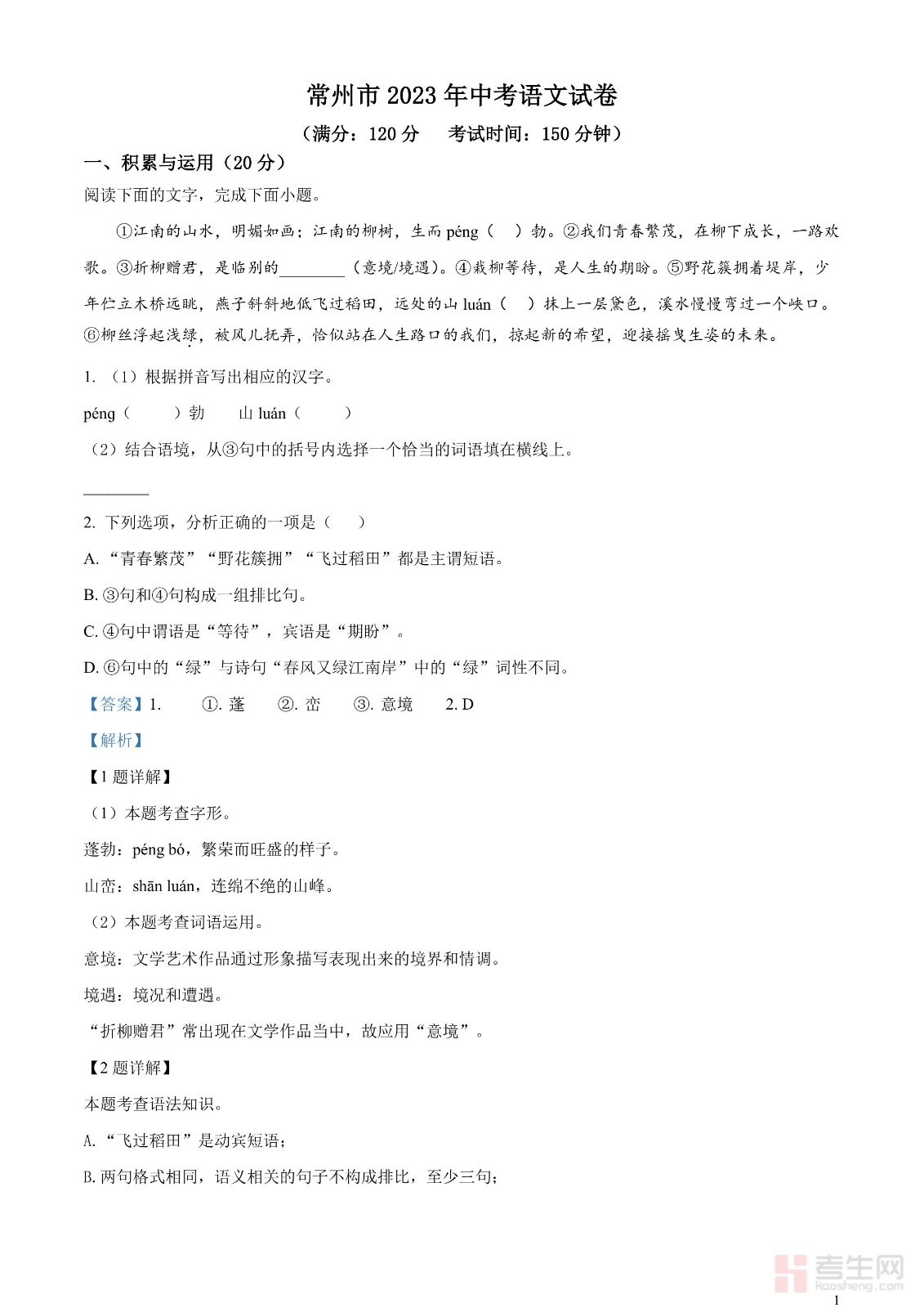 2023年江苏省常州市中考语文真题(解析版)