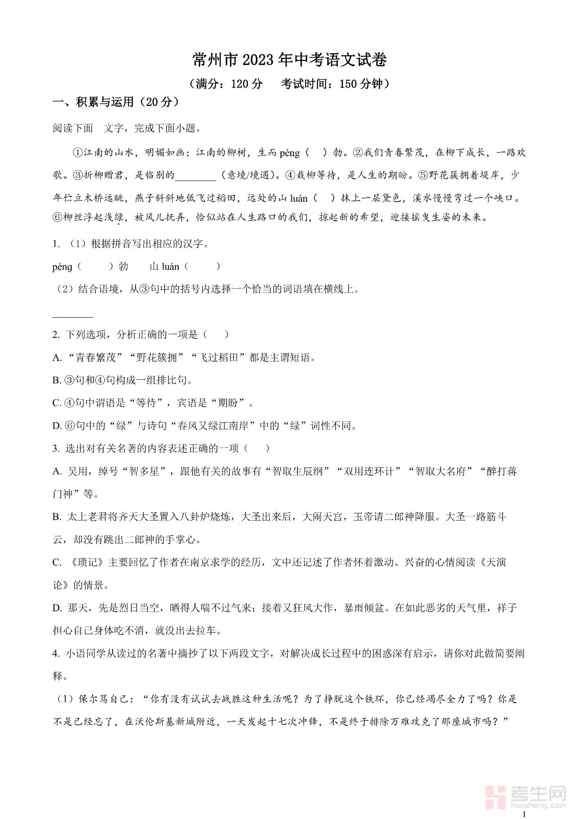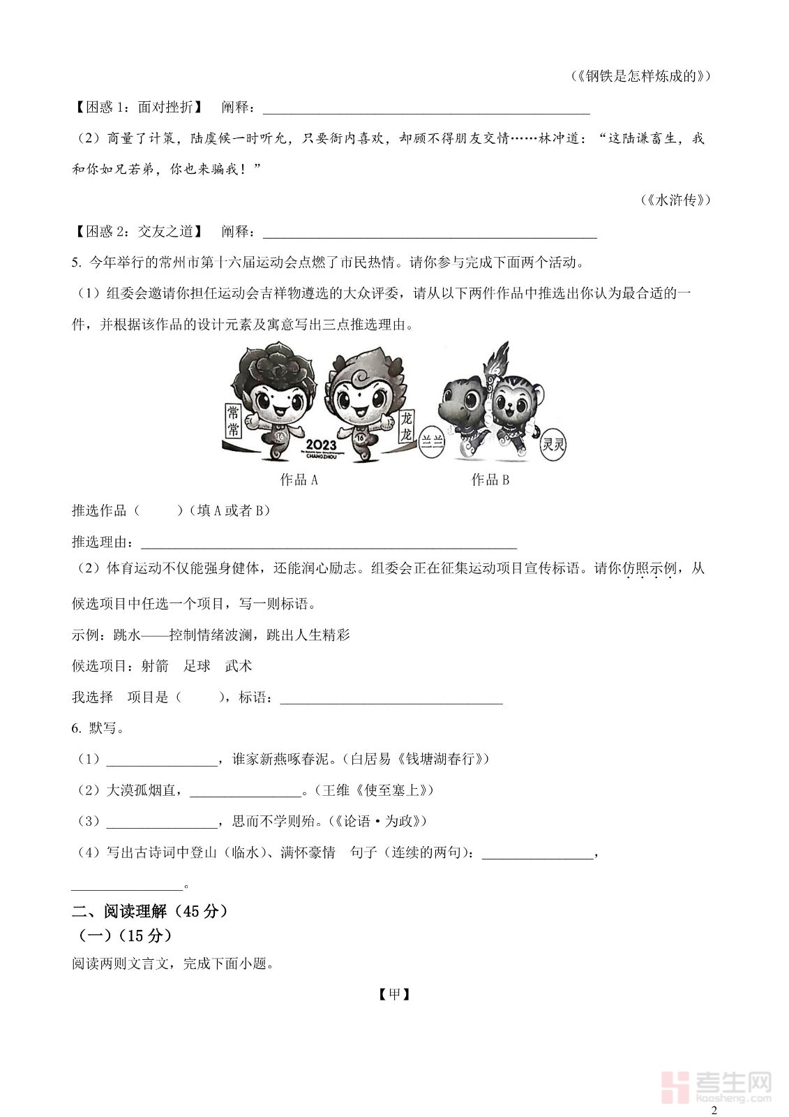 2023年江苏省常州市中考语文真题(原卷版)