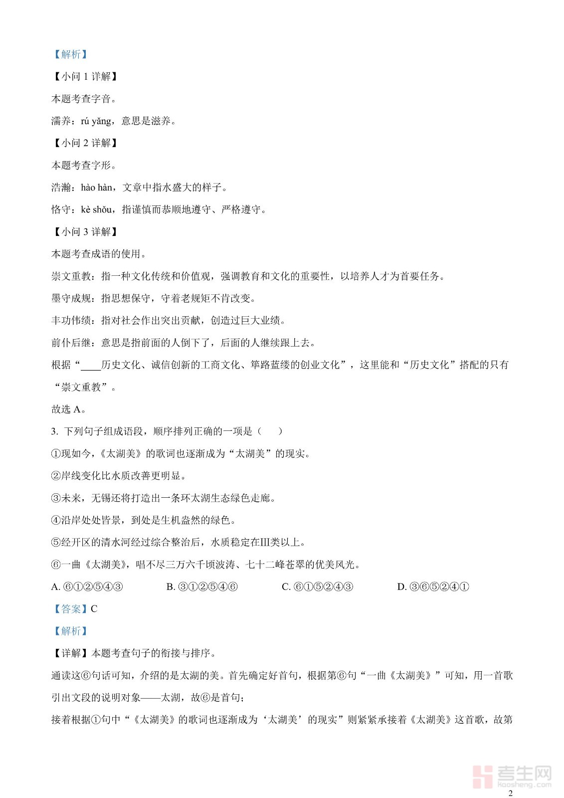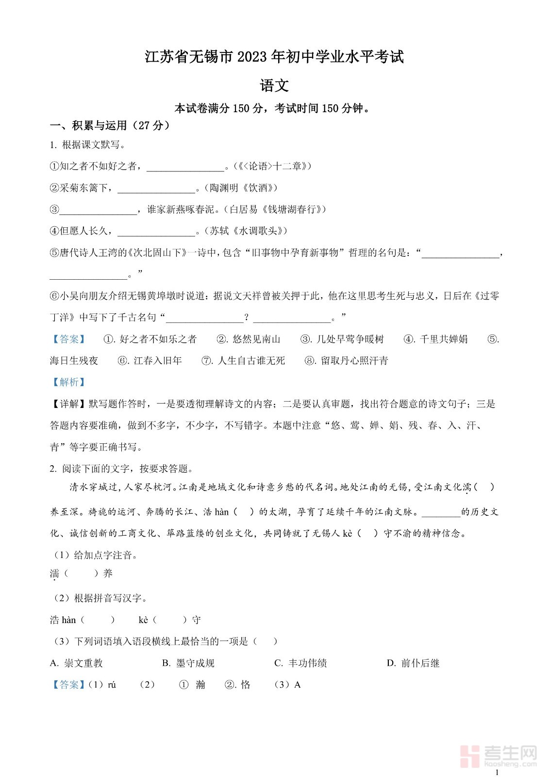 2023年江苏省无锡市中考语文真题(解析版)