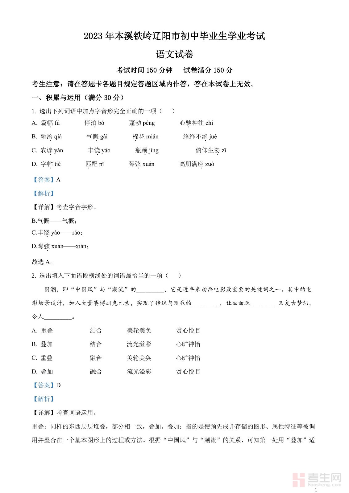 2023年辽宁省本溪市、铁岭市、辽阳市中考语文真题(解析版)