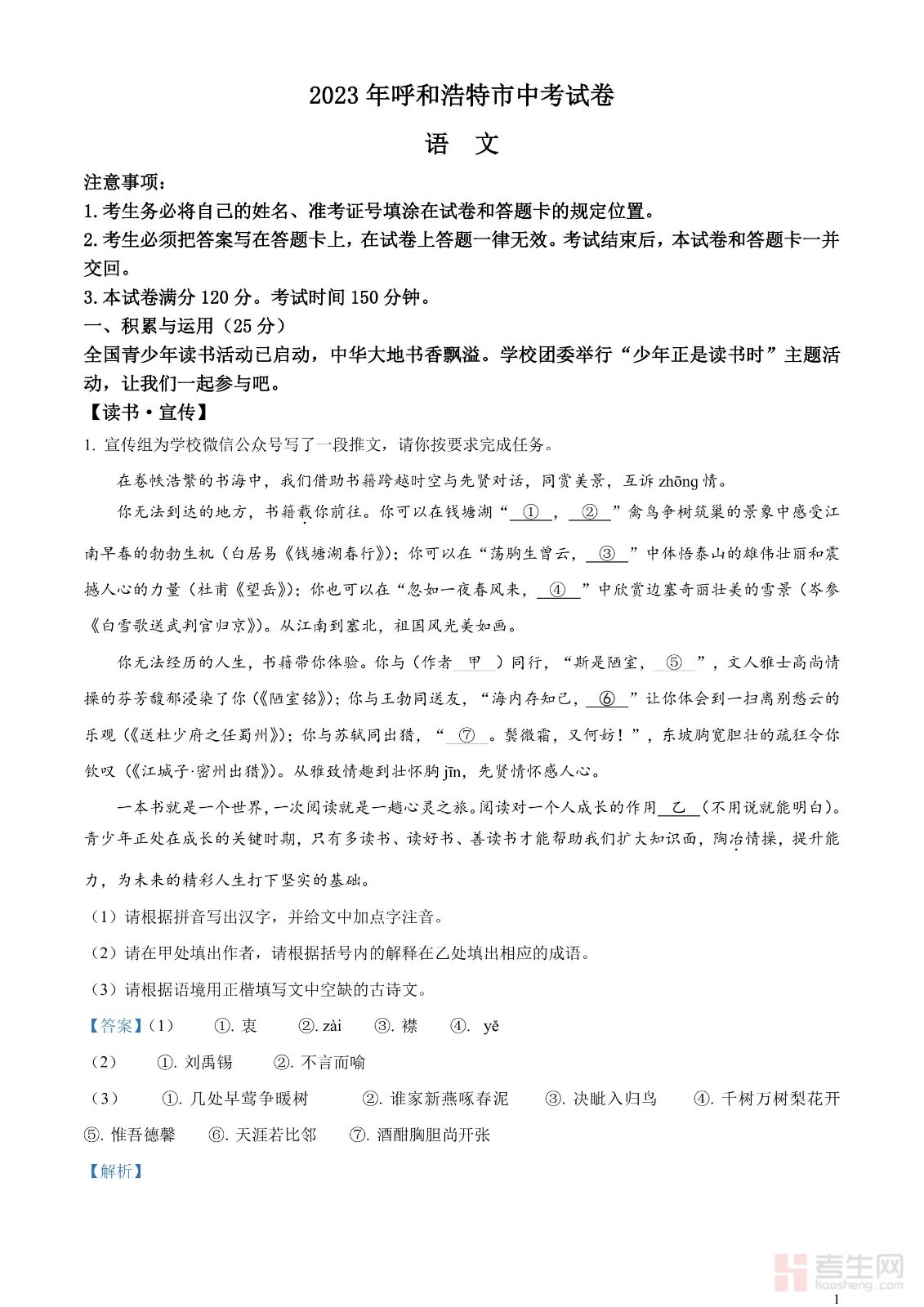2023年内蒙古呼和浩特市中考语文真题(解析版)