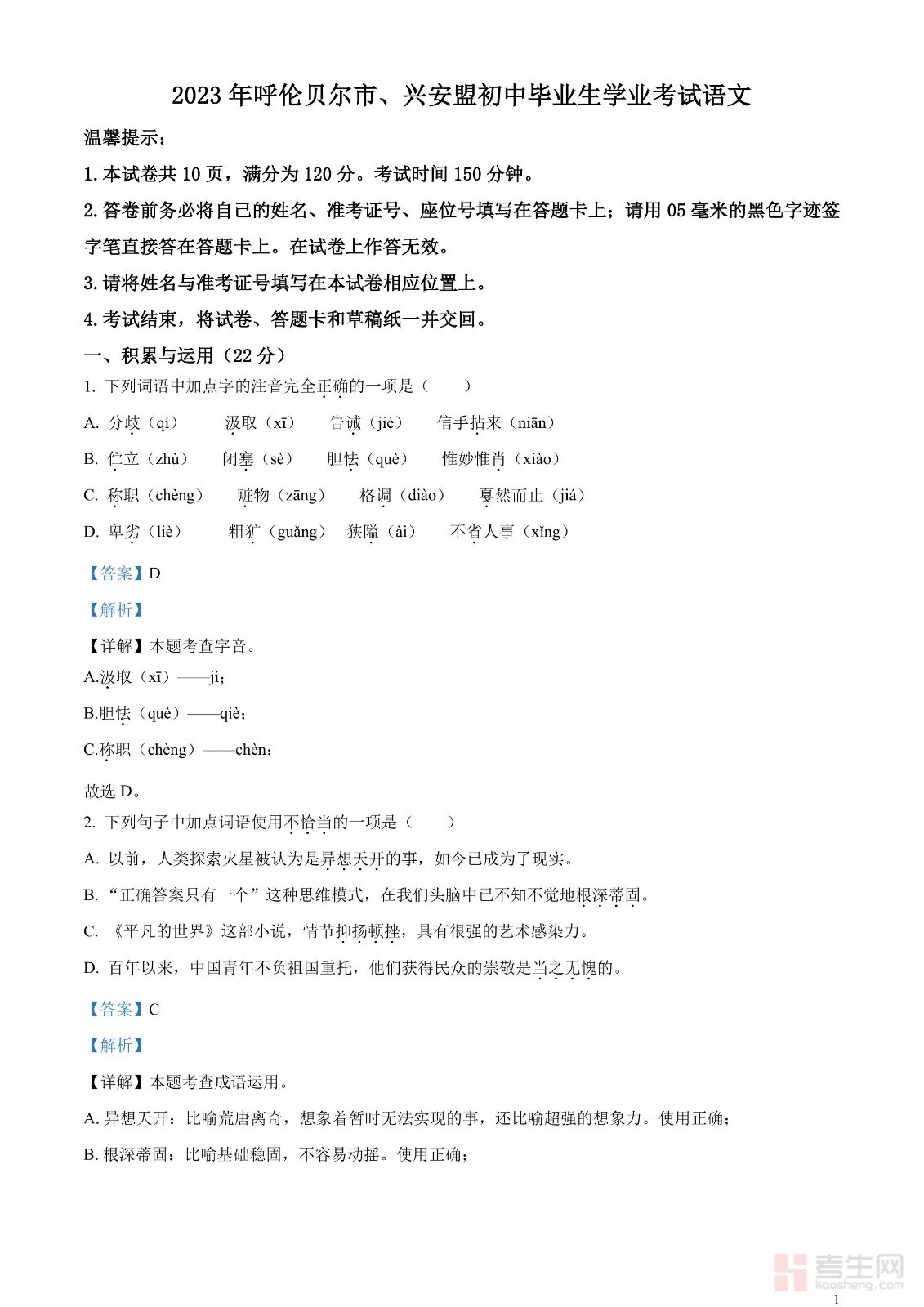 2023年内蒙古自治区兴安盟、呼伦贝尔市中考语文真题(解析版)
