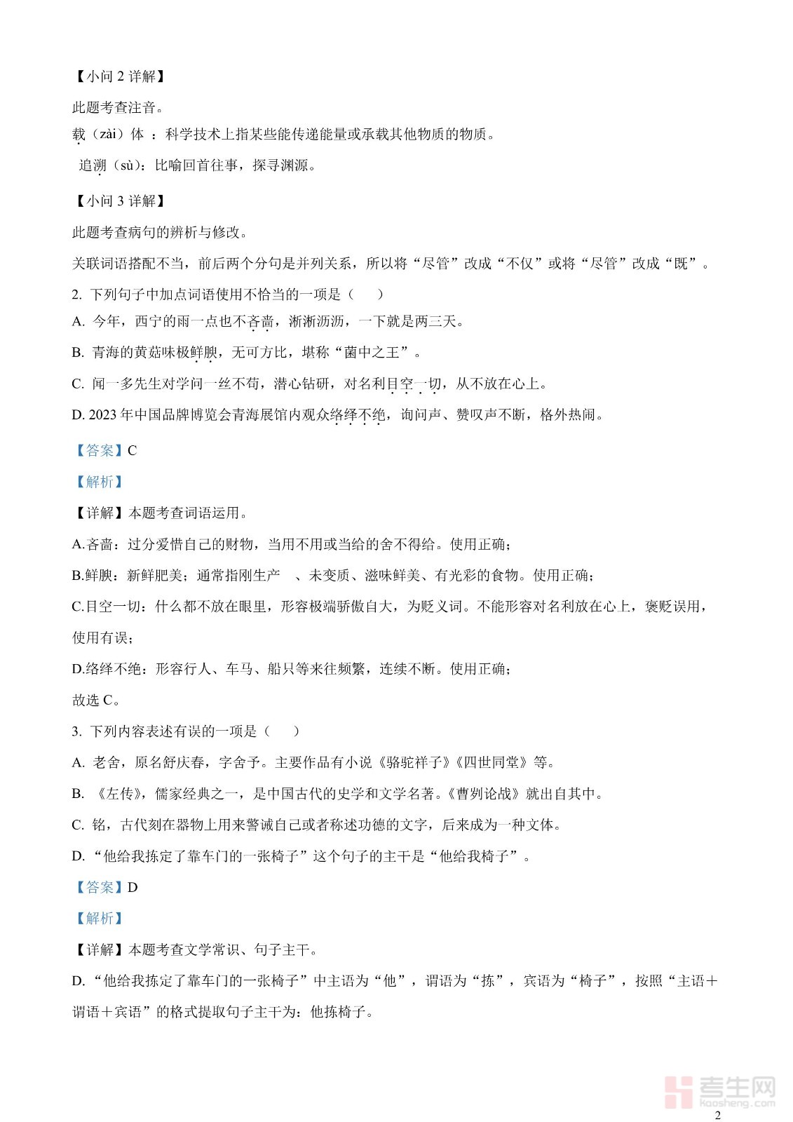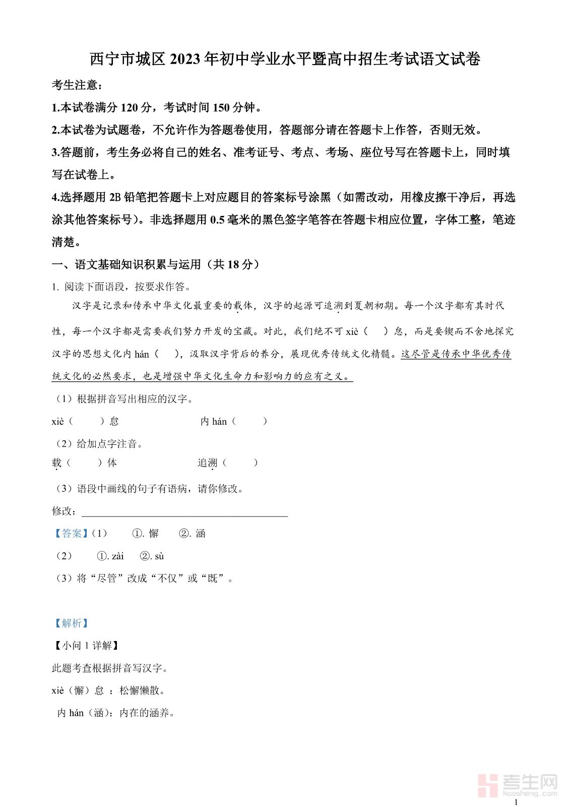 2023年青海省西宁市城区中考语文真题(解析版)