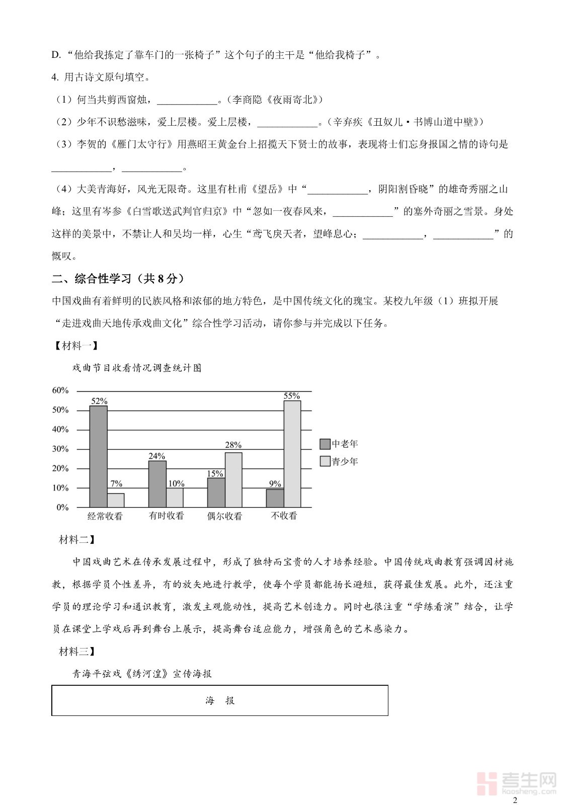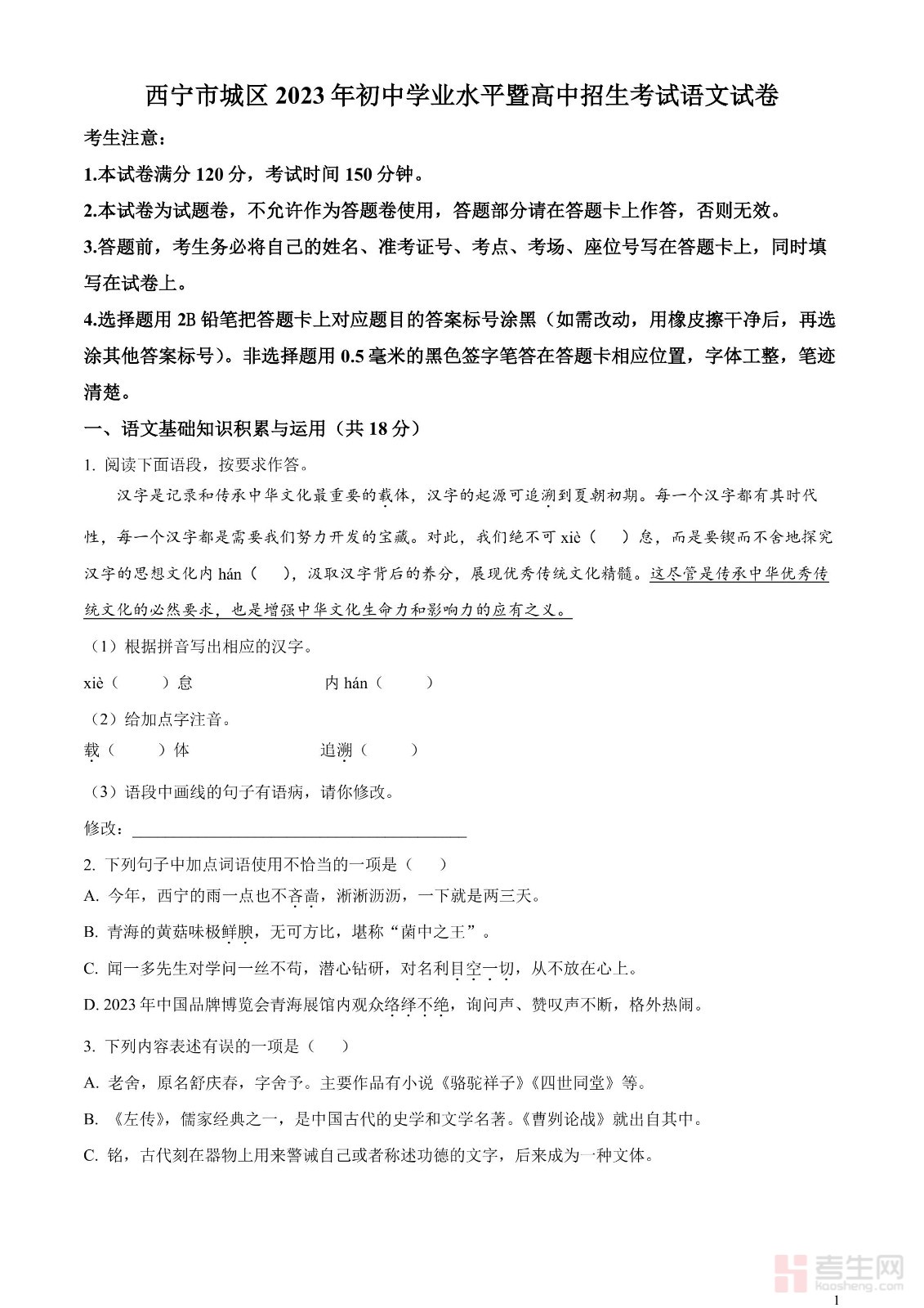 2023年青海省西宁市城区中考语文真题(原卷版)
