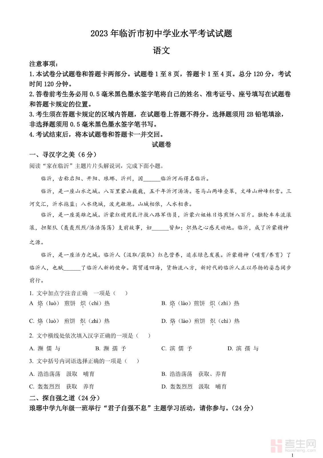 2023年山东省临沂市中考语文真题(原卷版)