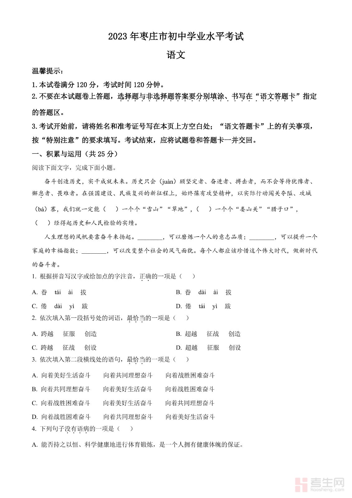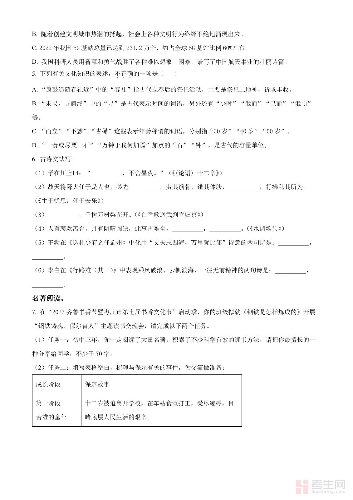 2023年山东省枣庄市中考语文真题(原卷版)
