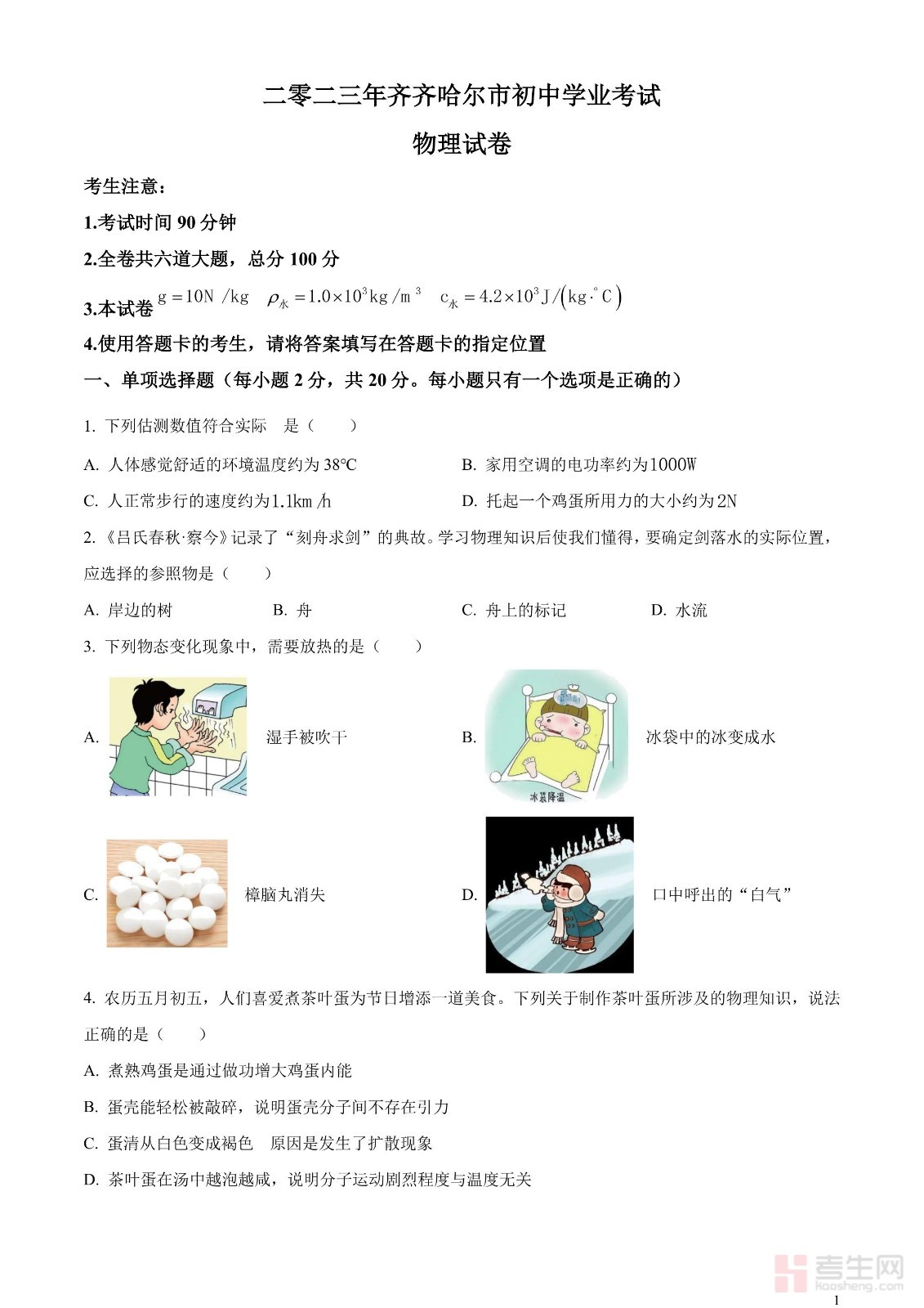 2023年黑龙江省齐齐哈尔市中考物理试题(原卷版)