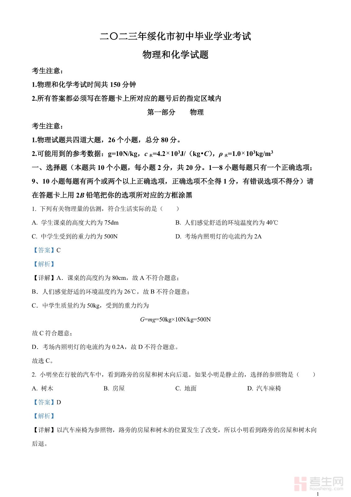 2023年黑龙江省绥化市中考物理试题(解析版)