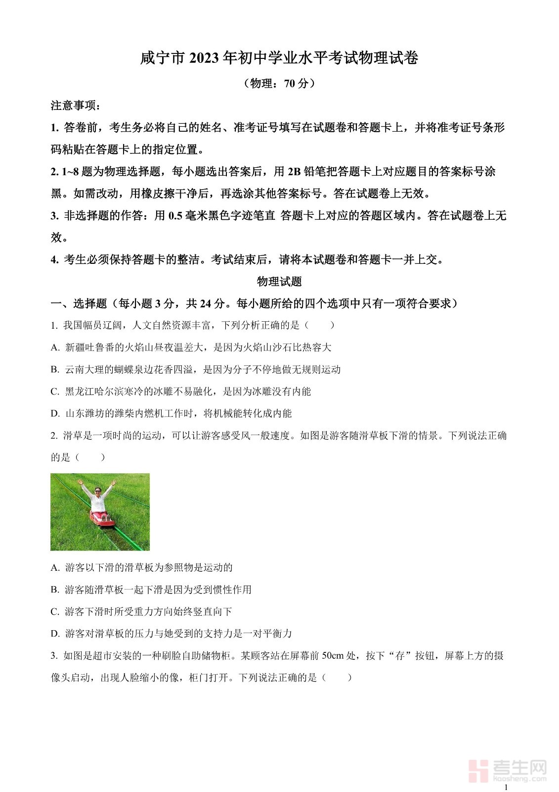 2023年湖北省黄冈市孝感市咸宁市中考理综物理试题(原卷版)