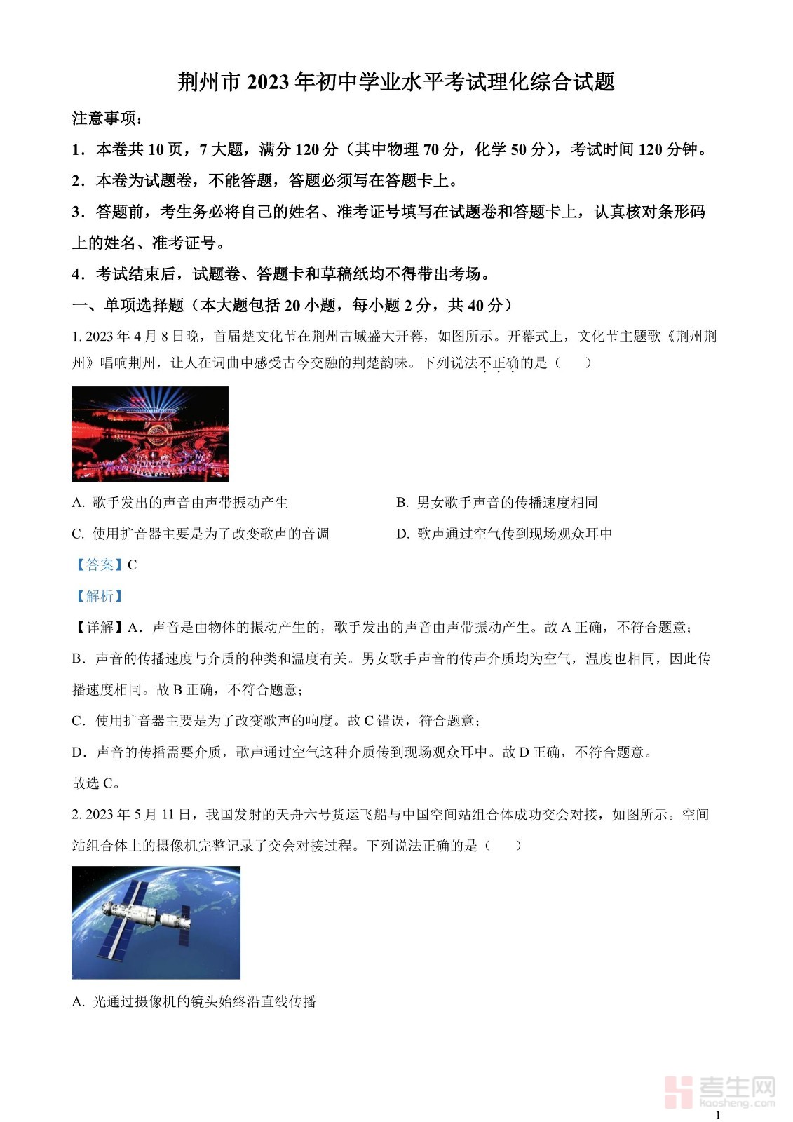 2023年湖北省荆州市中考理综物理试题(解析版)