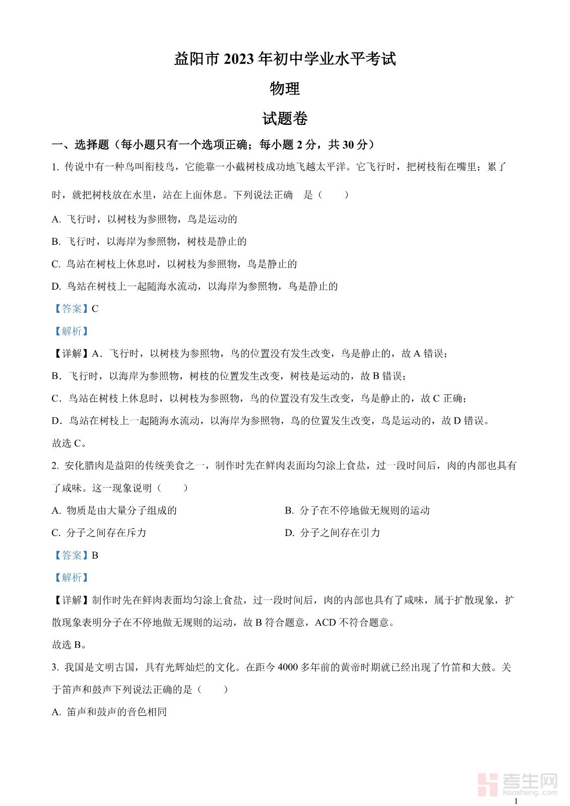 2023年湖南省益阳市中考物理试题(解析版)