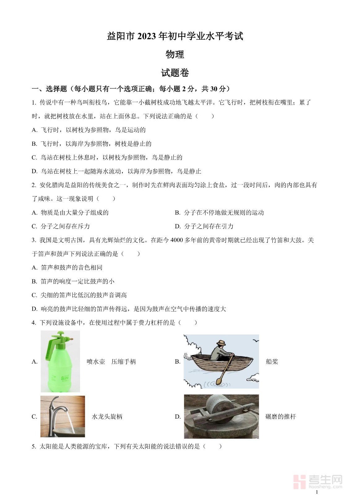 2023年湖南省益阳市中考物理试题(原卷版)