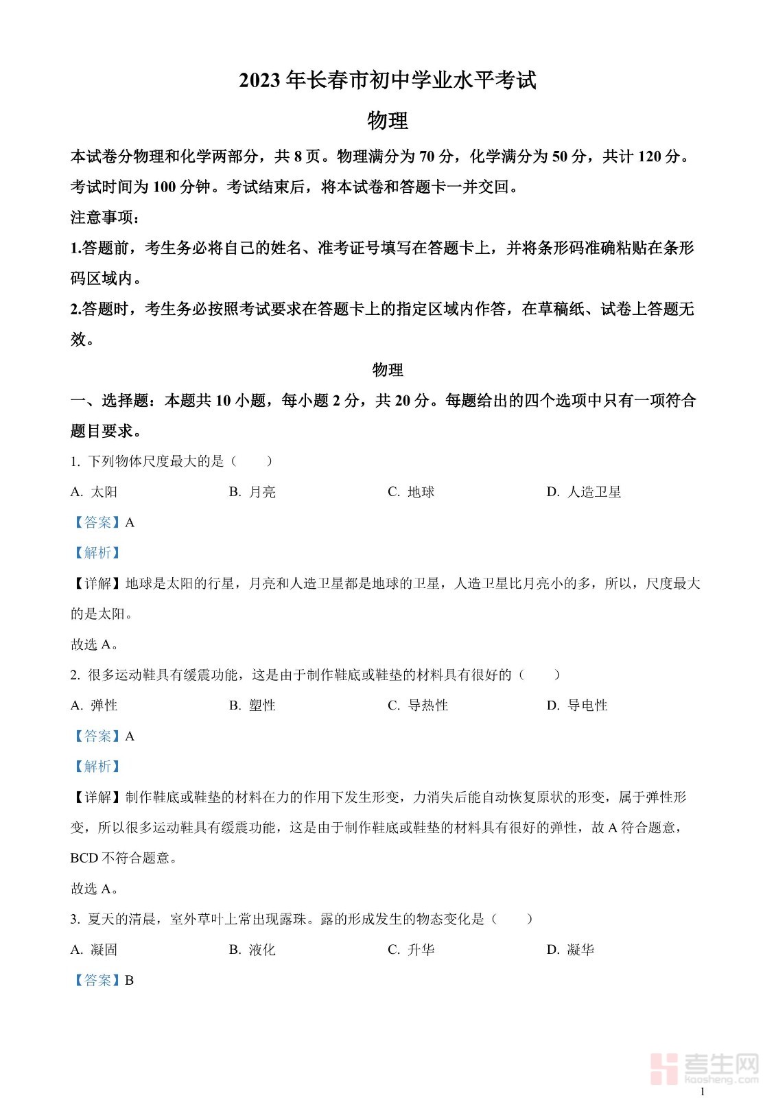 2023年吉林省长春市中考物理试题(解析版)