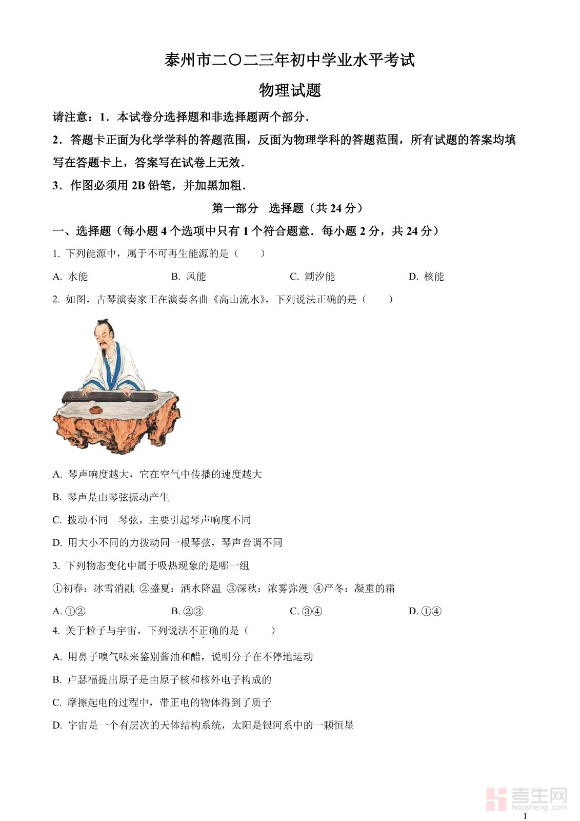 2023年江苏省泰州市中考物理试题(原卷版)