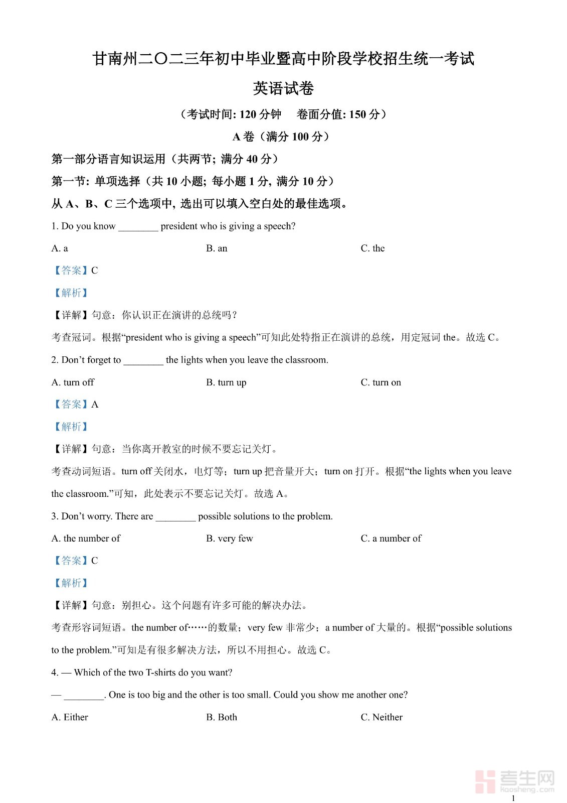 2023年甘肃省甘南藏族自治州中考英语真题(解析版)