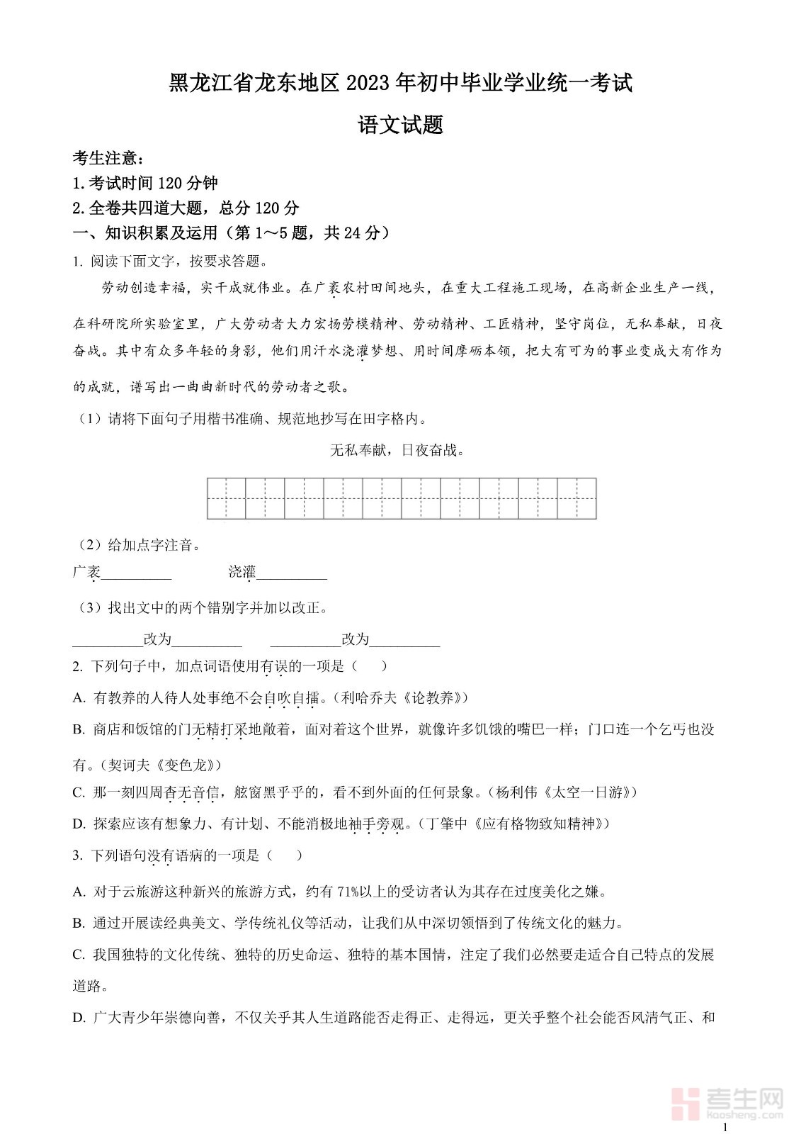 2023年黑龙江龙东地区中考语文真题(原卷版)