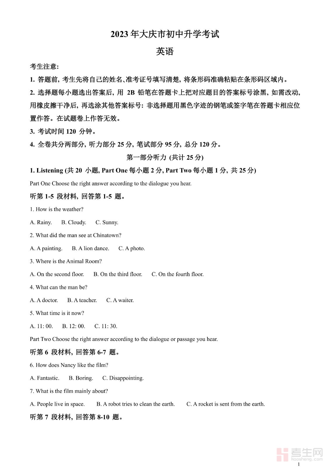 2023年黑龙江省大庆市中考英语真题(原卷版)
