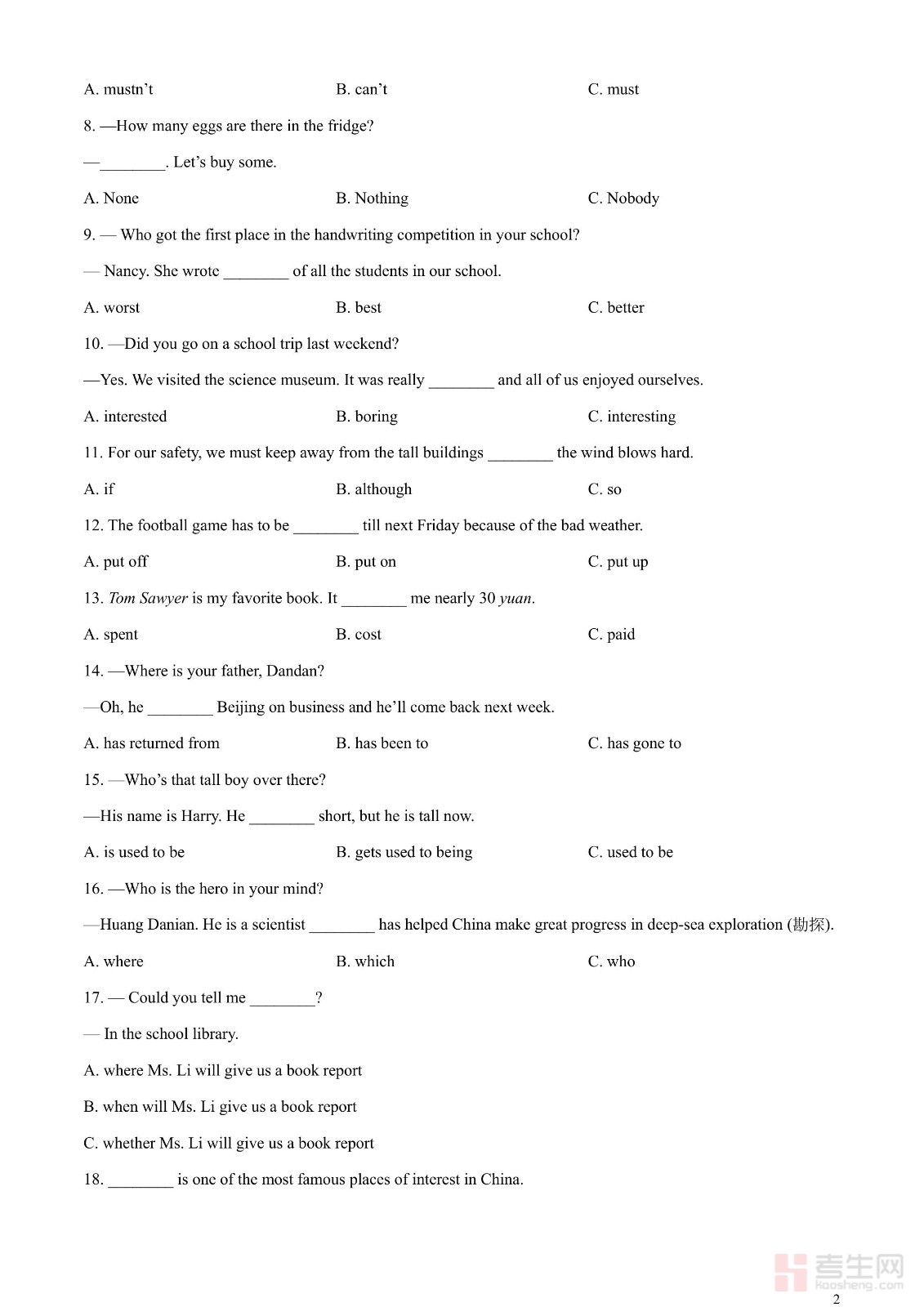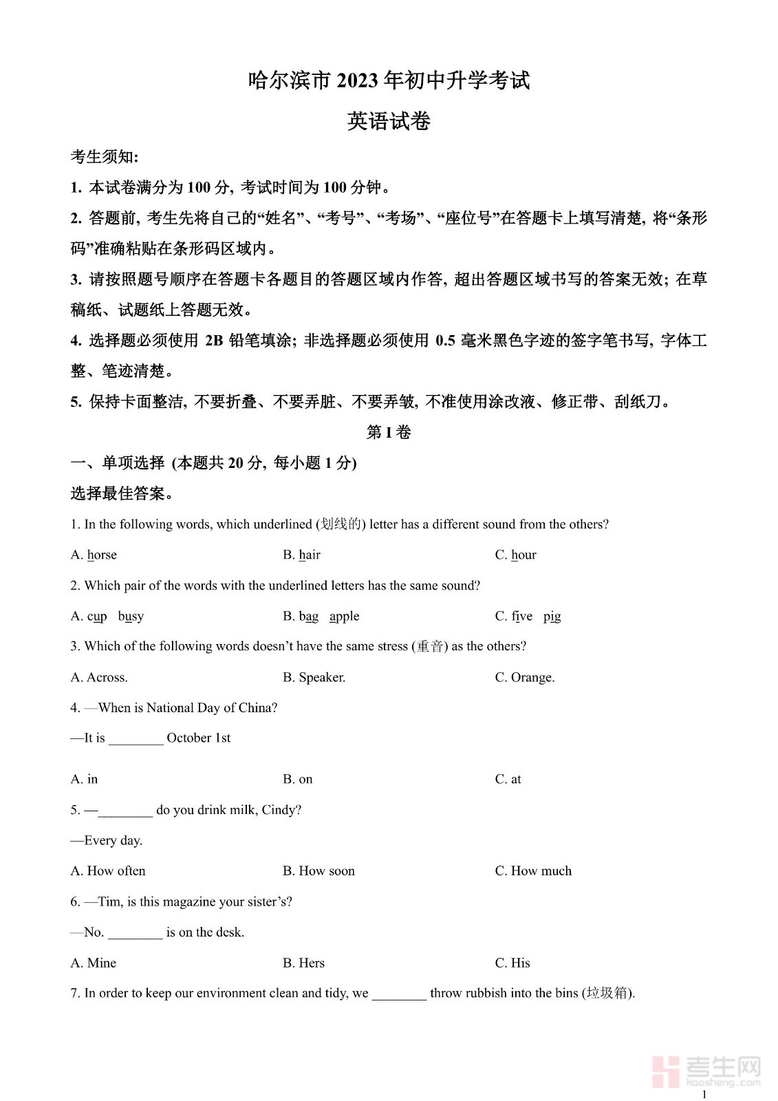 2023年黑龙江省哈尔滨市中考英语真题(原卷版)