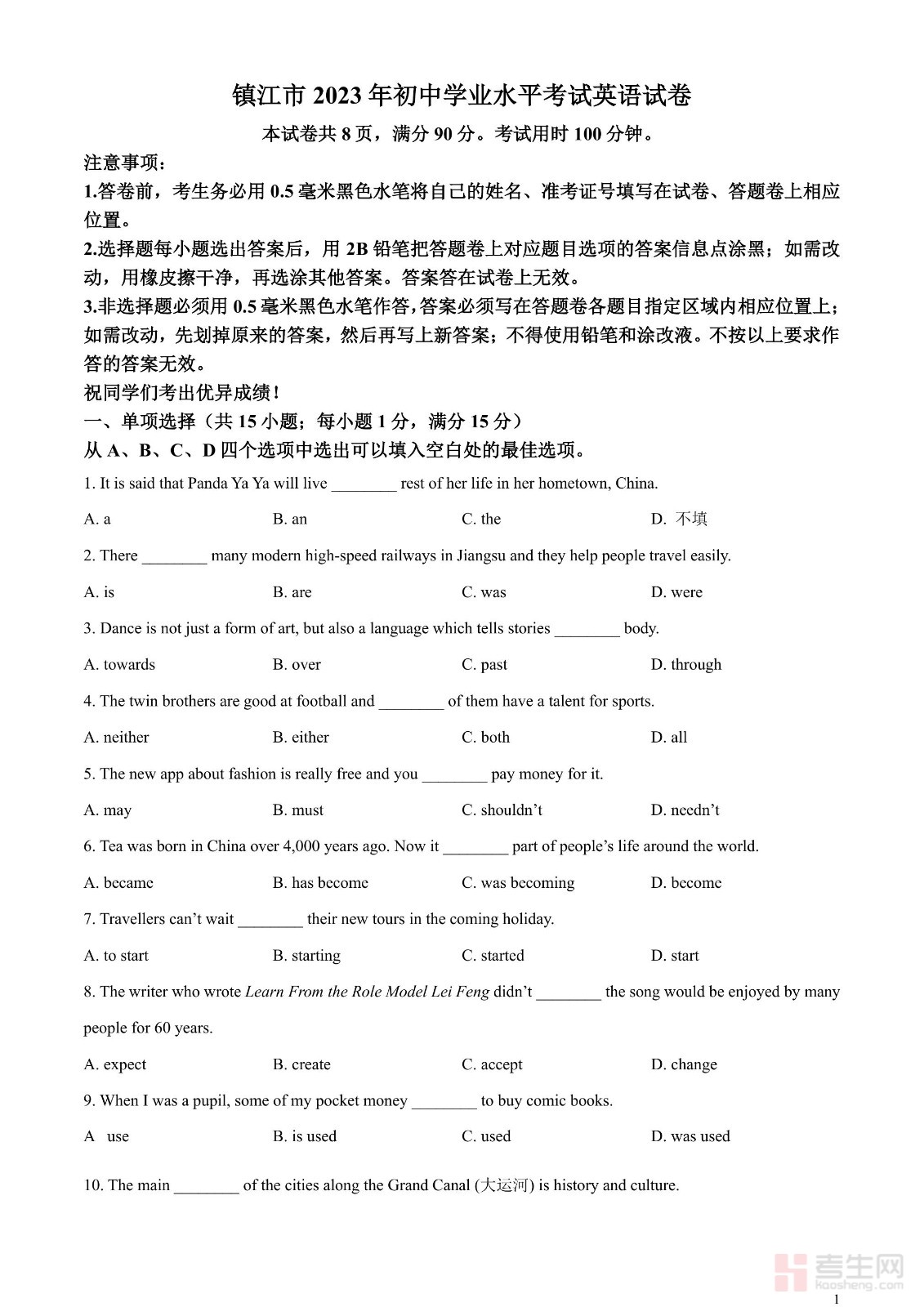 2023年江苏省镇江市中考英语真题 (原卷版)