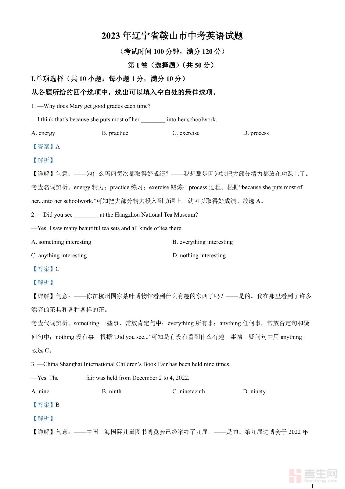 2023年辽宁省鞍山市中考英语真题(解析版)