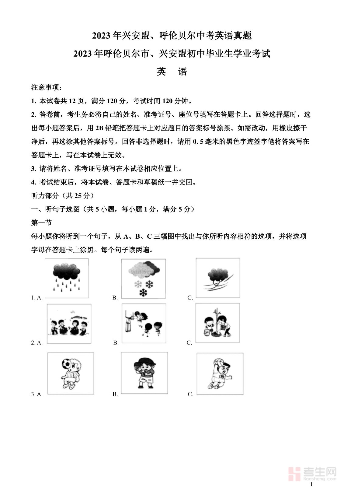 2023年内蒙古自治区兴安盟、呼伦贝尔市中考英语真题(原卷版)