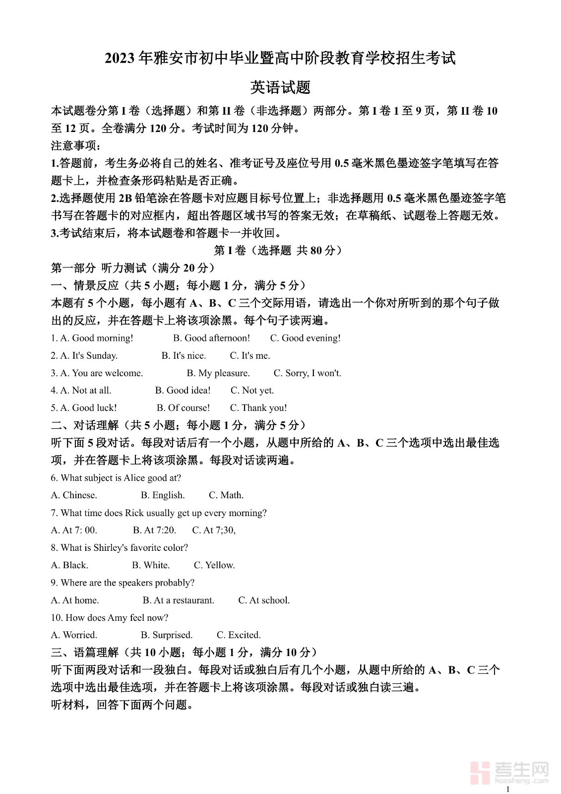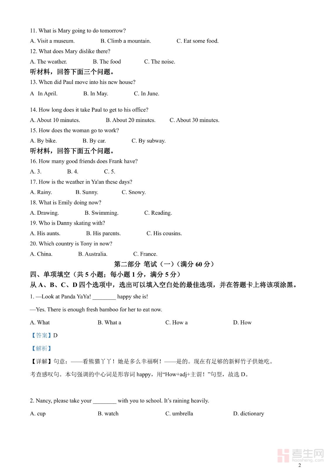 2023年四川省雅安市中考英语真题(解析版)