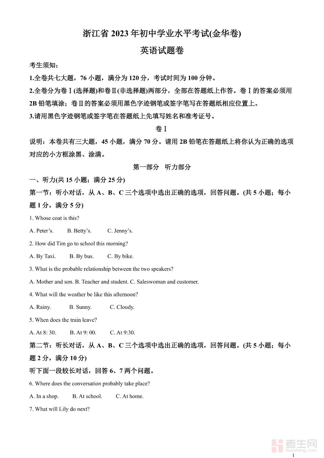 2023年浙江省金华市中考英语真题(原卷版)