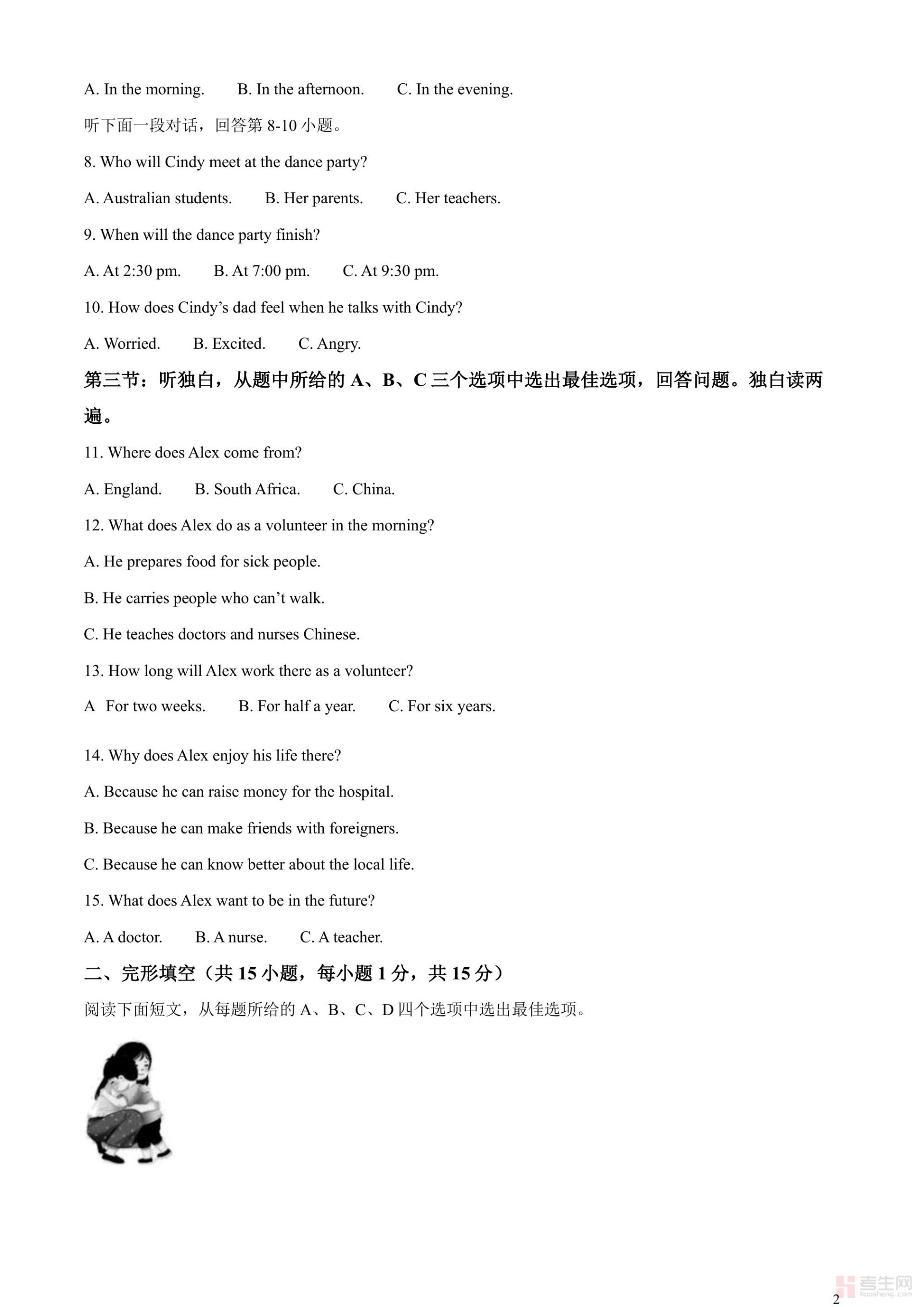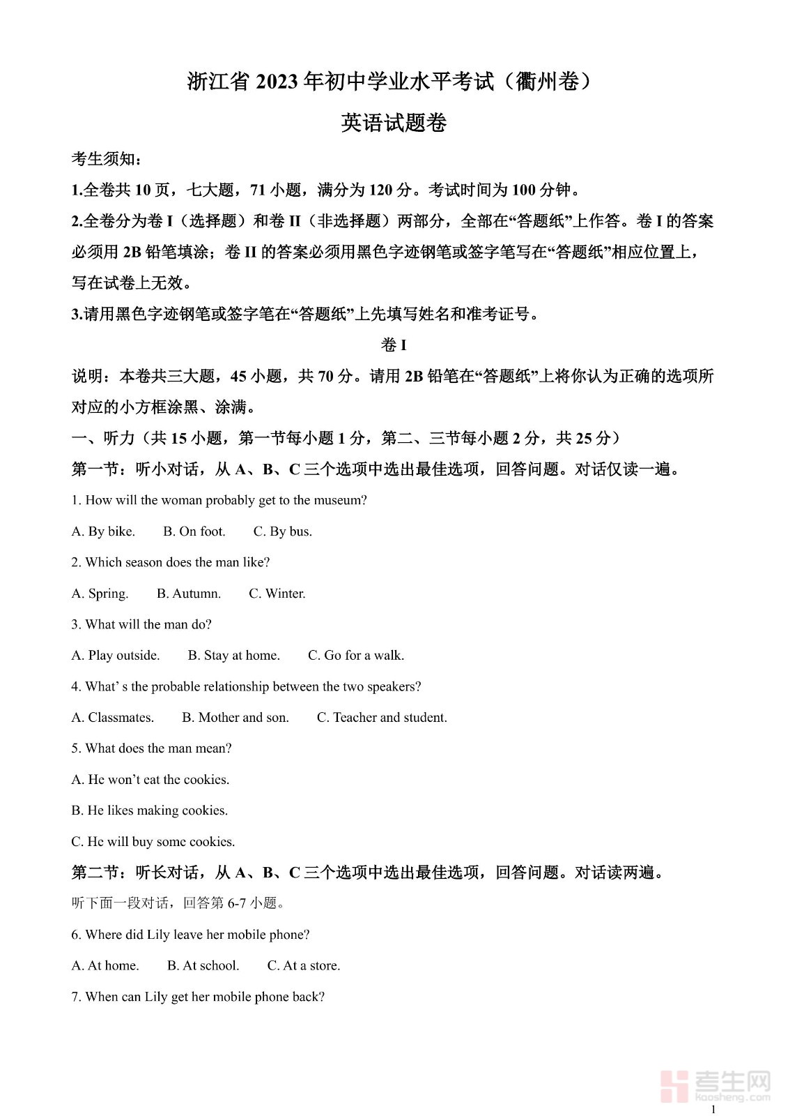 2023年浙江省衢州市中考英语真题 (原卷版)