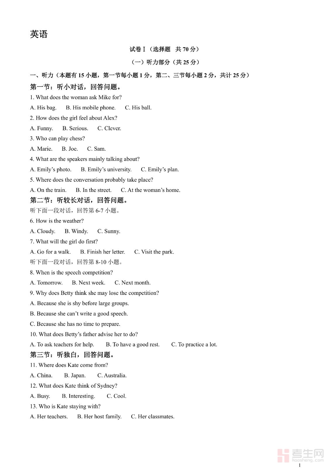 2023年浙江省绍兴市中考英语真题(原卷版)