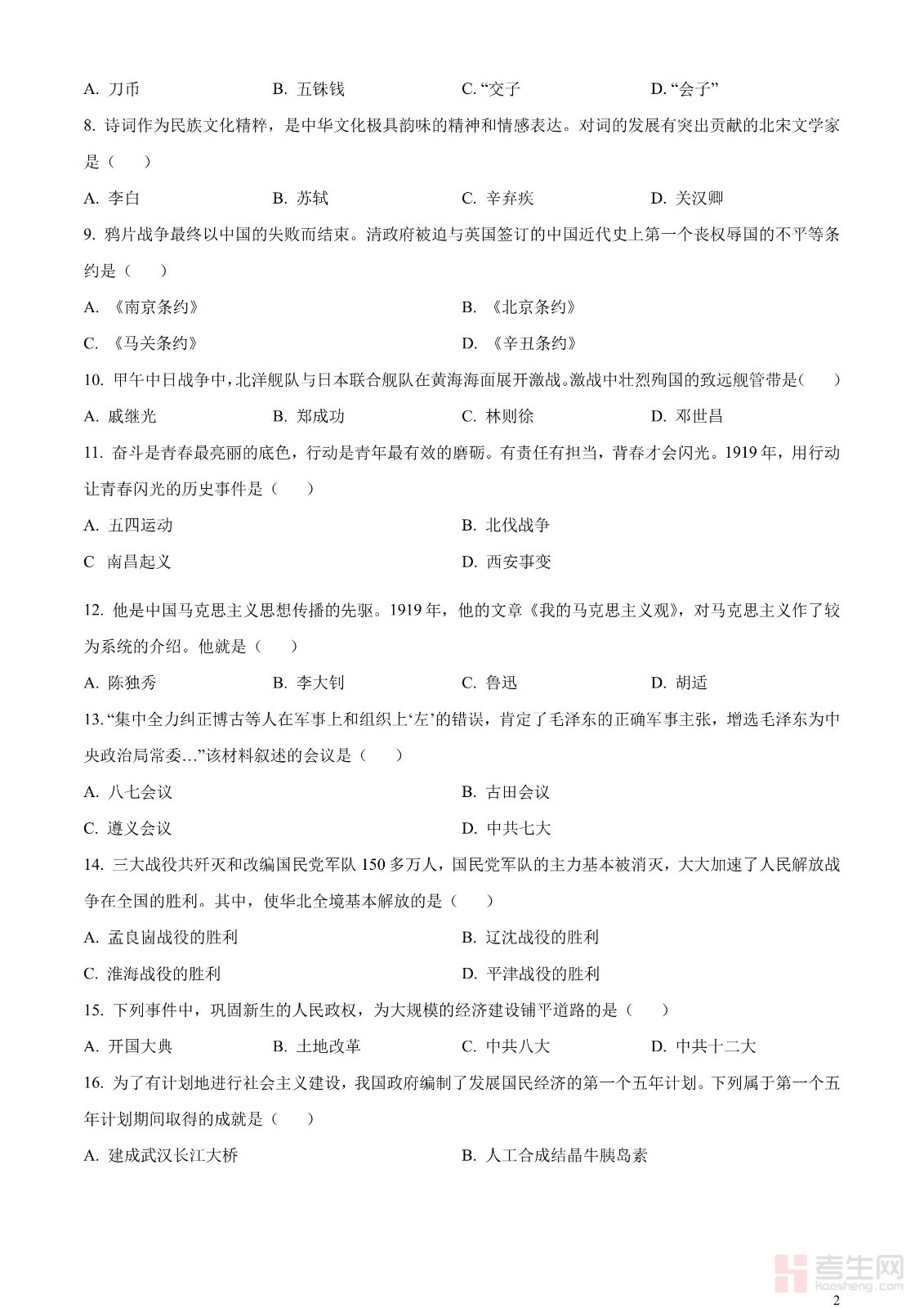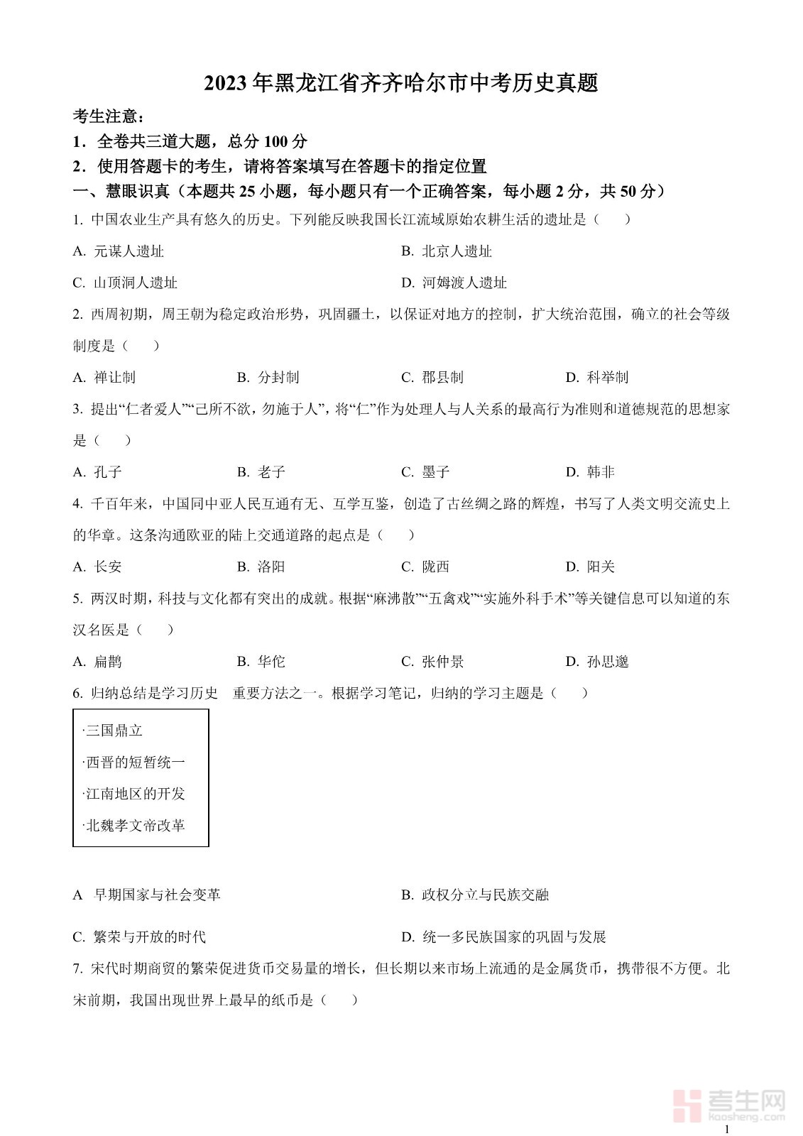 2023年黑龙江省齐齐哈尔市中考历史真题(原卷版)