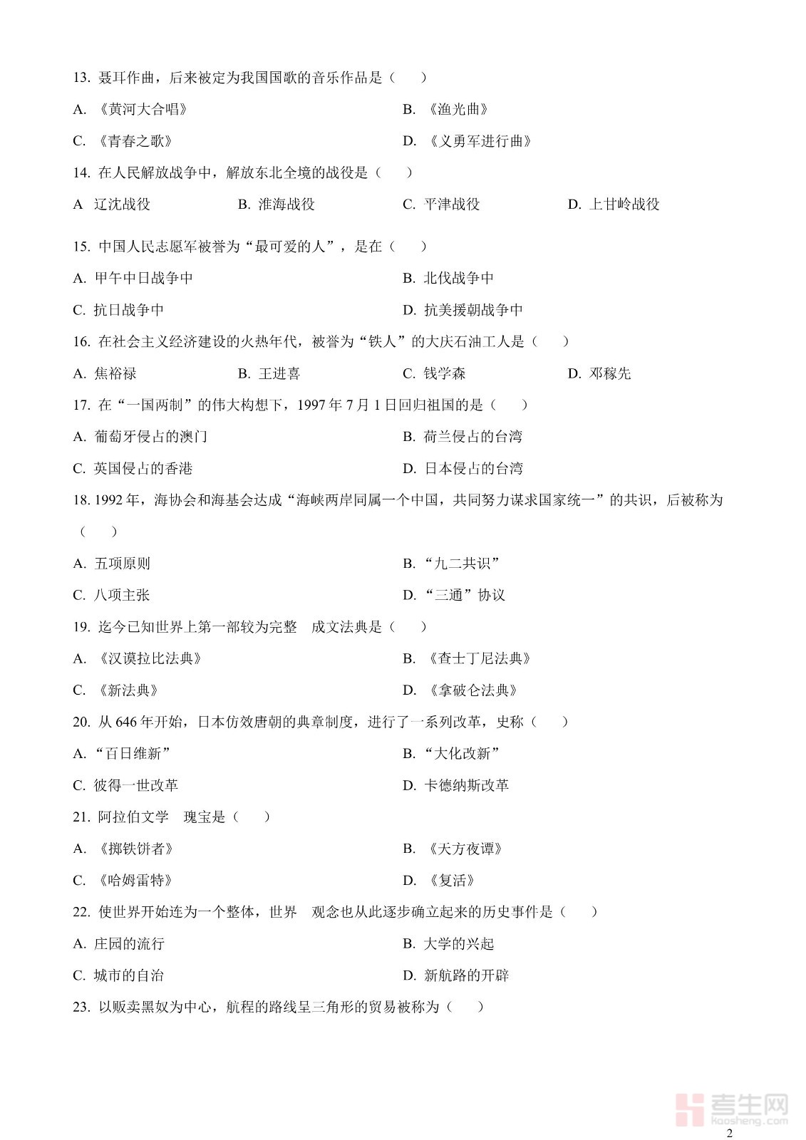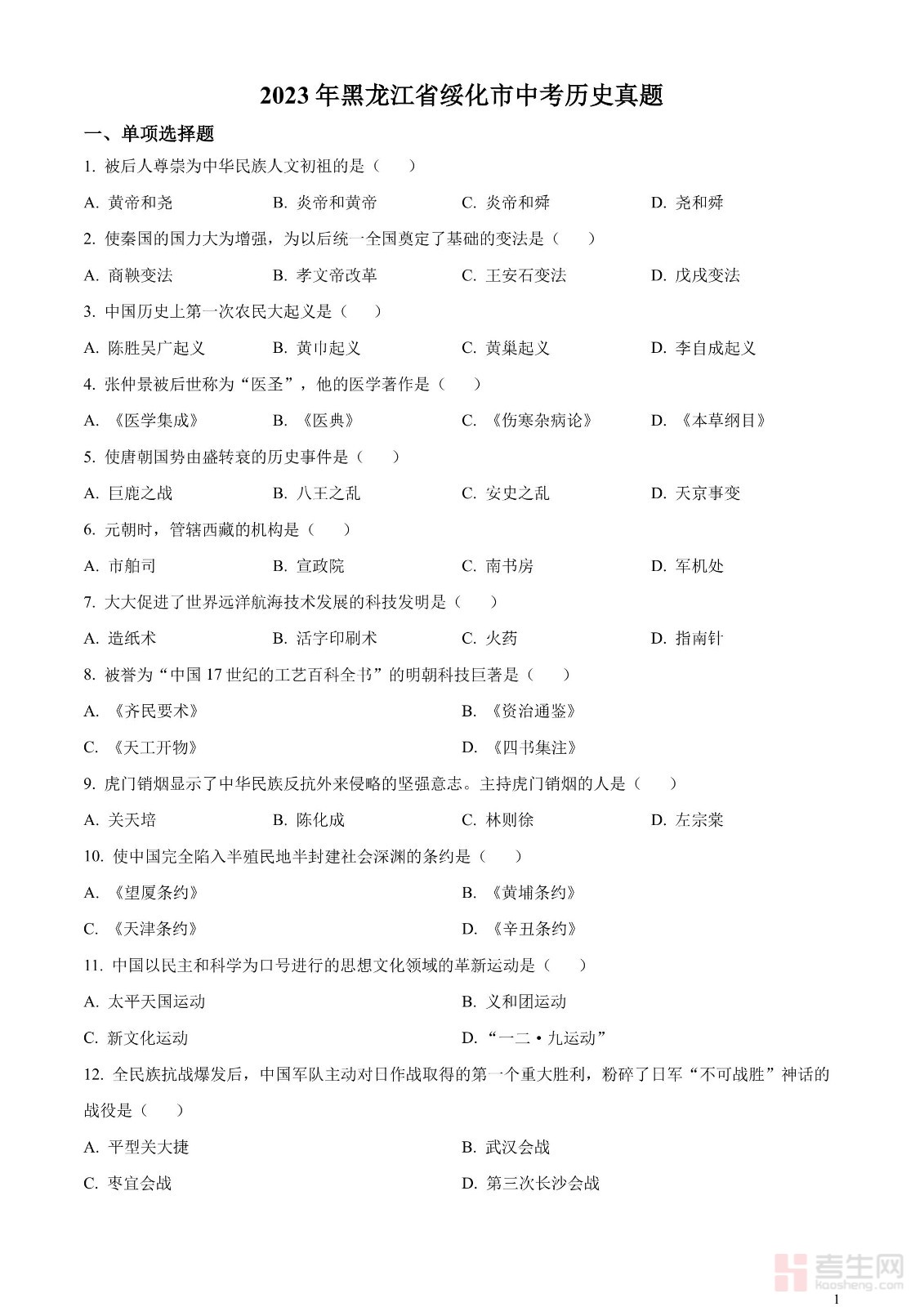 2023年黑龙江省绥化市中考历史真题(原卷版)