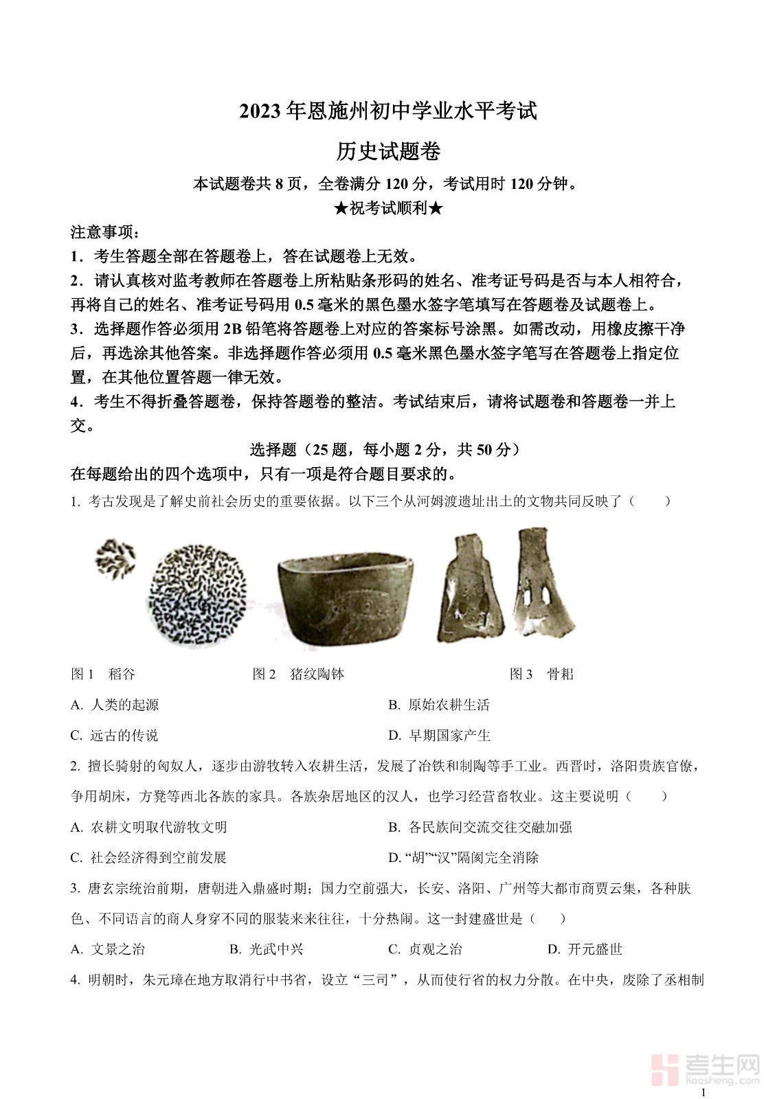 2023年湖北省恩施州中考历史真题(原卷版)