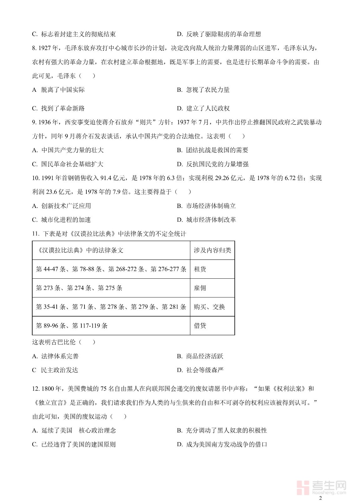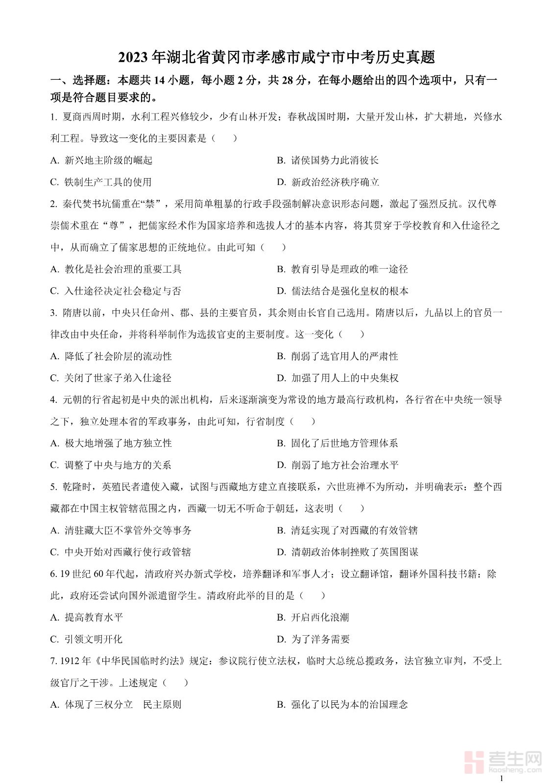 2023年湖北省黄冈市孝感市咸宁市中考历史真题(原卷版)