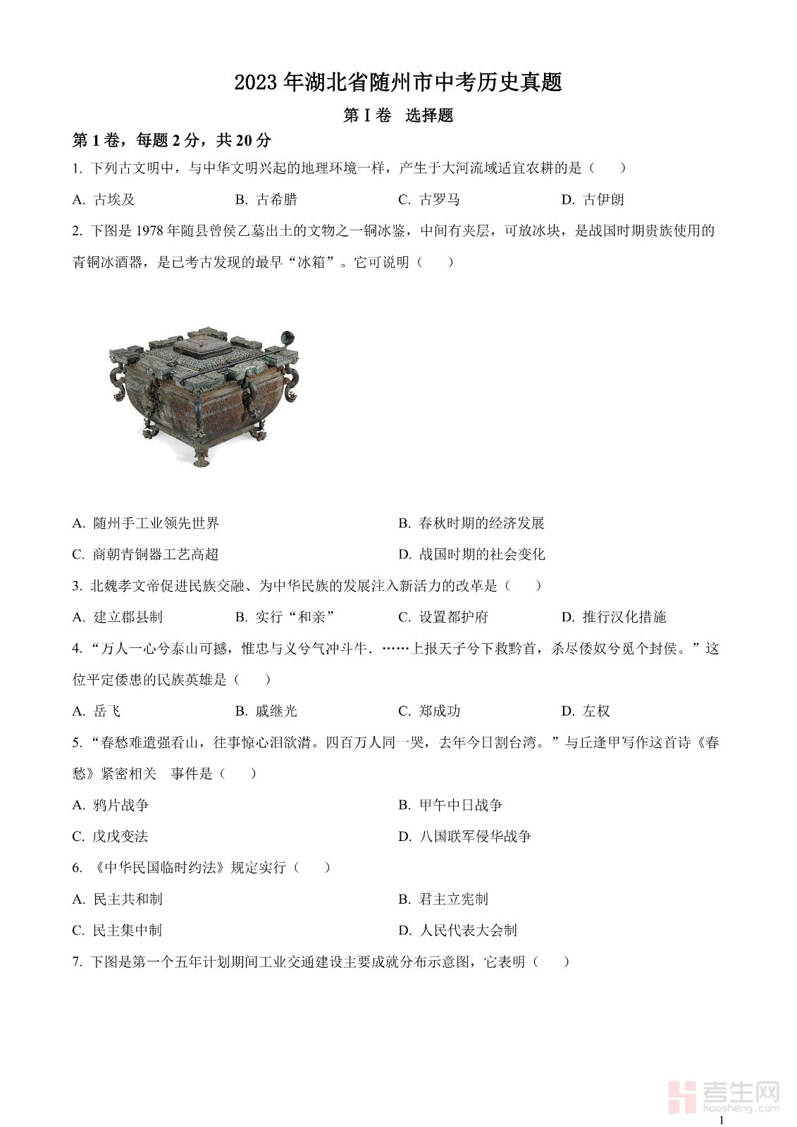 2023年湖北省随州市中考历史真题(原卷版)