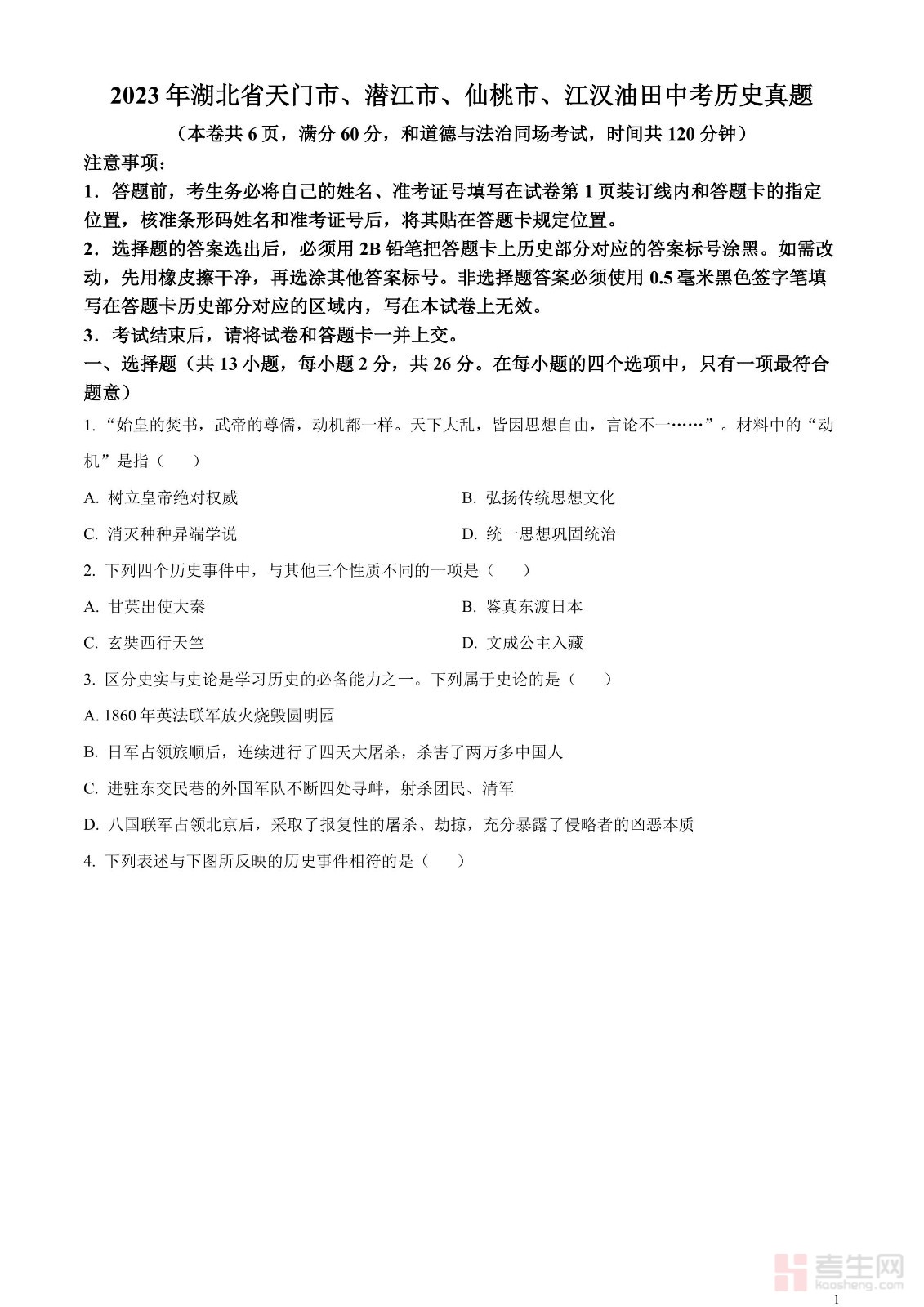 2023年湖北省天门市、潜江市、仙桃市、江汉油田中考历史真题(原卷版)